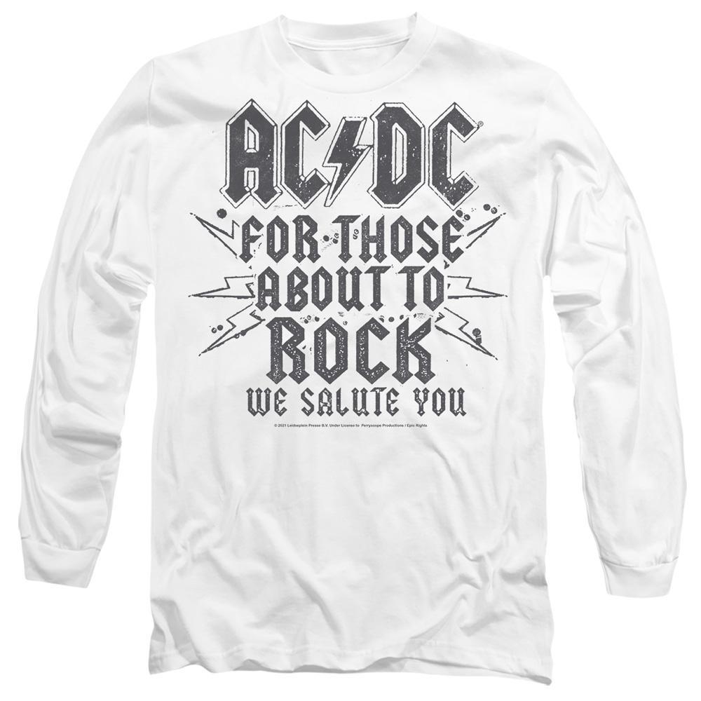 Dieses Langarm-T-Shirt verfügt über einen klassischen Rundhalsausschnitt und einen auffälligen Grafikdruck auf der Vorderseite, der der ikonischen Rockband AC/DC Tribut zollt. Das Design umfasst das Bandlogo und den Schriftzug „FOR THOSE ABOUT TO ROCK WE SALUTE YOU“, was es zu einem Statement-Stück für Fans macht.