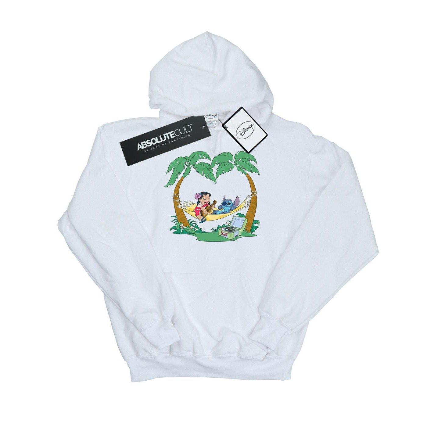 Dieser Kapuzenpullover zeigt eine verspielte Grafik von Lilo und Stitch, die in einer Hängematte zwischen Palmen entspannen, mit einem Plattenspieler in der Nähe. Er ist eine bequeme und stilvolle Wahl für die Freizeit.