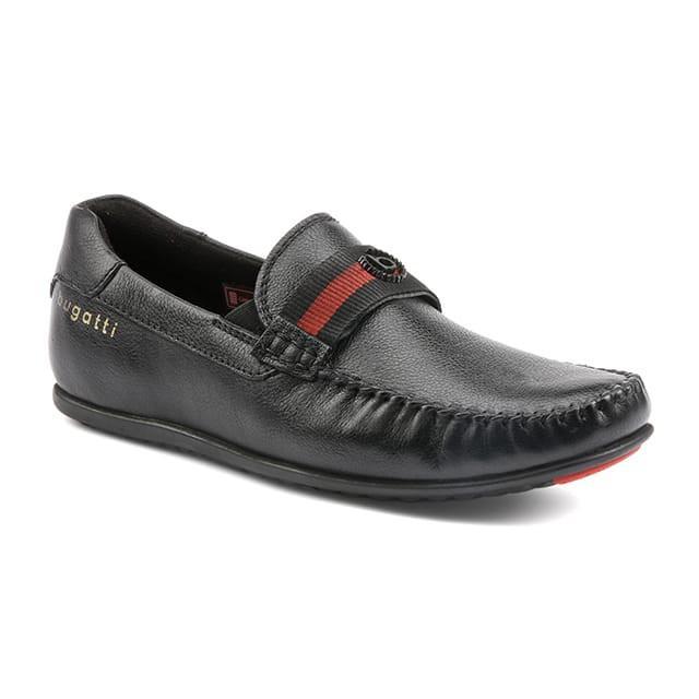 Details des Schuhs sind ein Leder-Loafer mit einem roten und schwarzen Gummiband, das durch den Vamp verläuft, ein rundes Logo am Bund und goldene Buchstaben "BUGATTI" auf der Seite des Schuhs. Eine kleine Ferse und Nähte Details entlang der Sohle runden dieses elegante Design ab. Die schwarze Farbe des Schuhs ist ideal für formelle Anlässe, wie Abende oder Veranstaltungen. Diese Loafers bieten Raffinesse, Komfort und Stil, die perfekt zu einem schicken Look passen.
