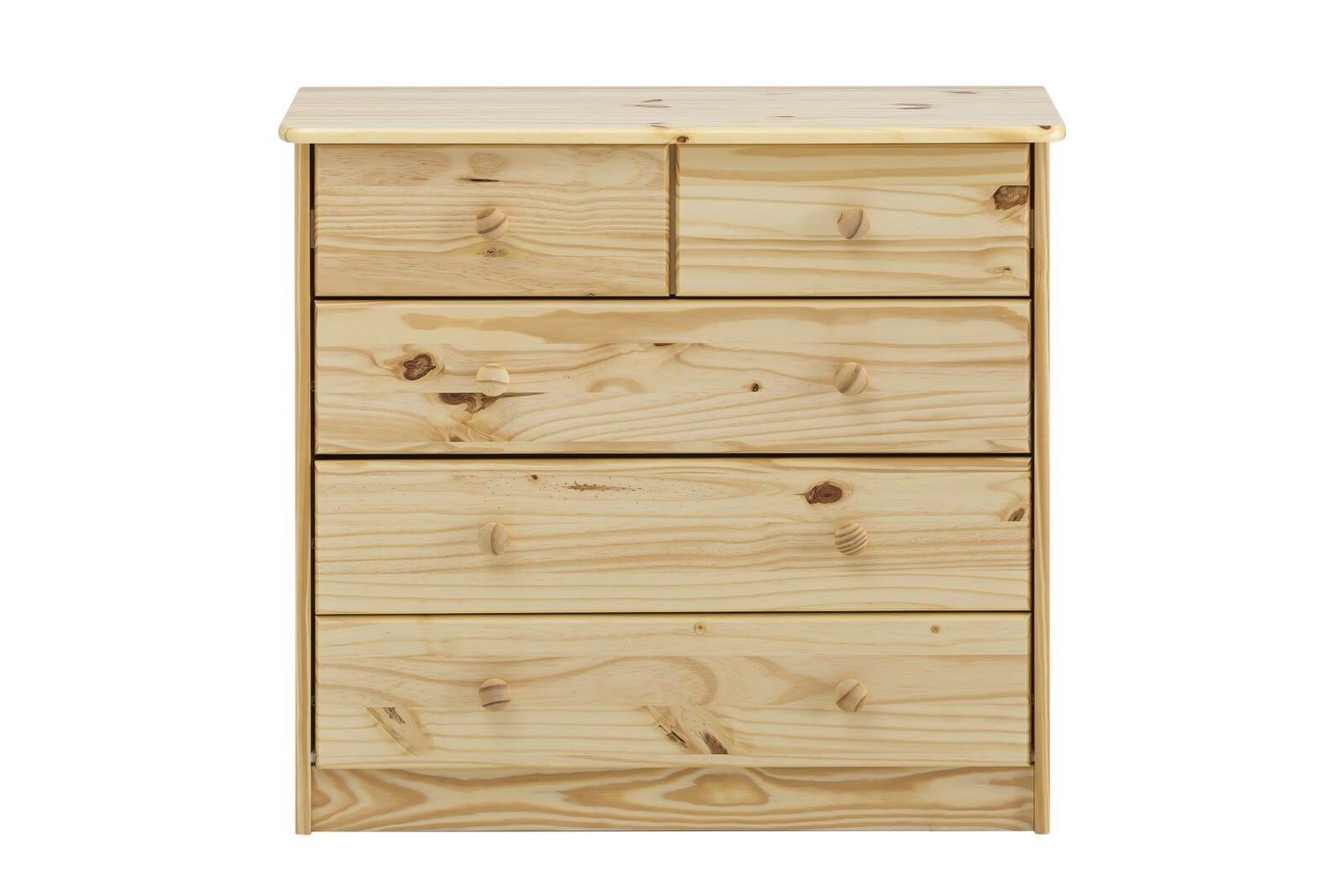 Diese solide und hochwertige Kommode ist aus massivem Kiefernholz gefertigt und die Oberflächen sind zum Schutz lackiert. Viel Stauraum und Platz für diverse Dinge befindet sich in 2 kleinen und 3 grossen Schubladen mit Metallauszügen. Ein sehr funktionales Möbelstück, das nicht nur pflegeleicht, sondern auch vielseitig verwendbar ist ideal zum Beispiel für ein Studentenzimmer, kleine Räume oder Kinderzimmer.zeitloses Designpflegeleichte Oberflächevielseitig verwendbarfünf Schubladen mit Metallauszügenviel StauraumProduktinformationen: Schubladen mit Metallauszügen, Innenmasse der Schubladen: oben 2x ca. B29,5xT32,5xH10,5 cm, unten 3x ca. B67xT32,5xH10,5 cm