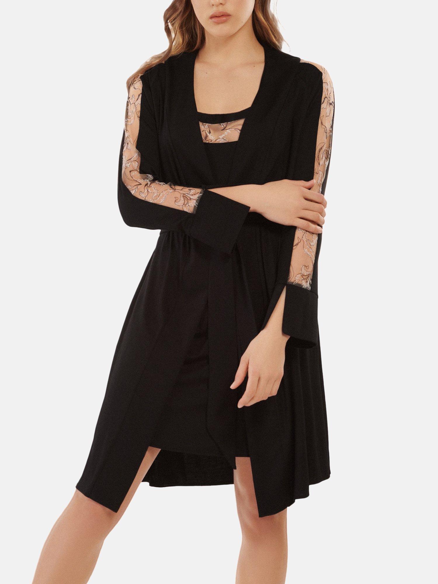 Die bestickten Einsätze in Kombination mit dem feinen, mercerisierten Viskose-Strick sorgen für Verführung und vor allem für Eleganz. Dieses Stück kann sowohl im als auch ausserhalb des Schlafzimmers getragen werden. Die Serie ist mit durchdachten Besätzen und zusätzlichen Schlitzen versehen, die die Kleidungsstücke beleben. Erhältlich in festlichem Dunkelrot, um zu glänzen, oder in verführerischem Schwarz, das mit interessanten kontrastierenden schwarzen und fleischfarbenen Stickereien verziert ist.