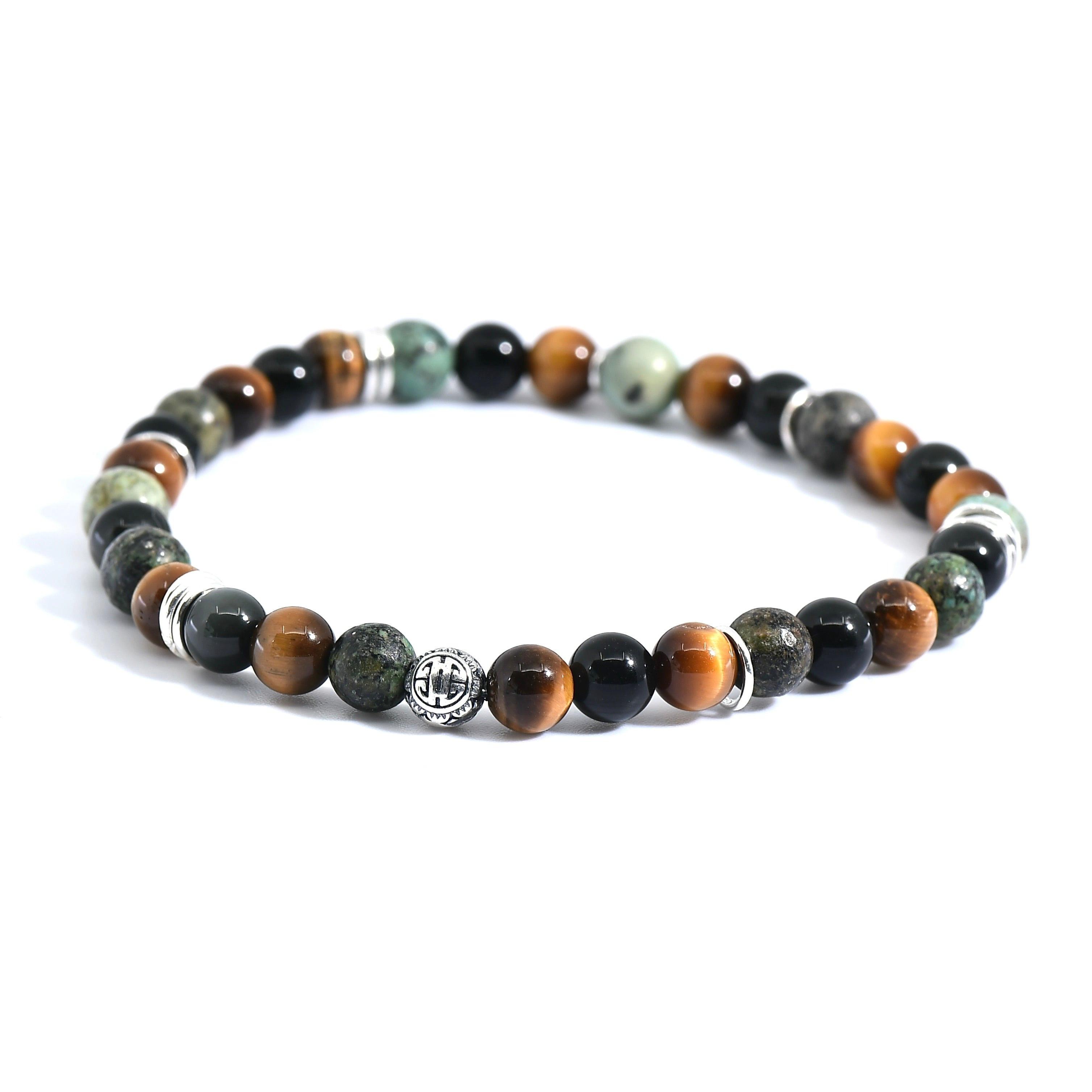 Dieses kraftvolle Männer Armband kombiniert Onyx, Tigeraugen, Achat und den als afrikanischen Türkis bekannten Kambaba Jaspis. Veredelt wird es durch 925 Sterling Silber Ringe und eine gravierte Kugel aus echtem Silber. Die einzigartige Kombination verleiht dem Armband eine maskuline, natürliche Ausstrahlung, während die Silberdetails für edlen Stil und hochwertigen Glanz sorgen. Ein vielseitiges Accessoire, das perfekt jeden Look abrundet.