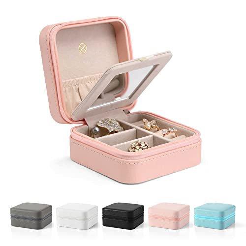 * Praktisches Reise-Schmuckkästchen: Dieses kleine, hübsche Schmuckkästchen ist nur 10,5 x 10,5 x 5,5 cm groß und wiegt mit Spiegel 200 g. Dank ihrer geringen Größe können Sie sie bequem auf Reisen mitnehmen. So sind Ihre schönen Schmuckschätze leicht zu greifen. * Bester Schutz für Ihren Schmuck: robuster Außenkörper und weiches Innenfutter mit Flockfaser zum Schutz Ihres Schmucks vor Druck, Kratzern und Feuchtigkeit. Das kleine Schmuckkästchen ist aus hochwertigem Kunstleder gefertigt, hat einen Reißverschluss und einen harten und klaren Schminkspiegel. * Kleine Größe, geräumiger Stauraum: Das Schmuckkästchen enthält Schwammstreifen für Ringe/Ohrstecker, 3 Fächer mit herausnehmbaren Trennwänden, elastische Tasche für Ketten. Armbänder wie Pandora, kleine Accessoires wie Lippenstift, Broschen und Uhren können ebenfalls untergebracht werden.