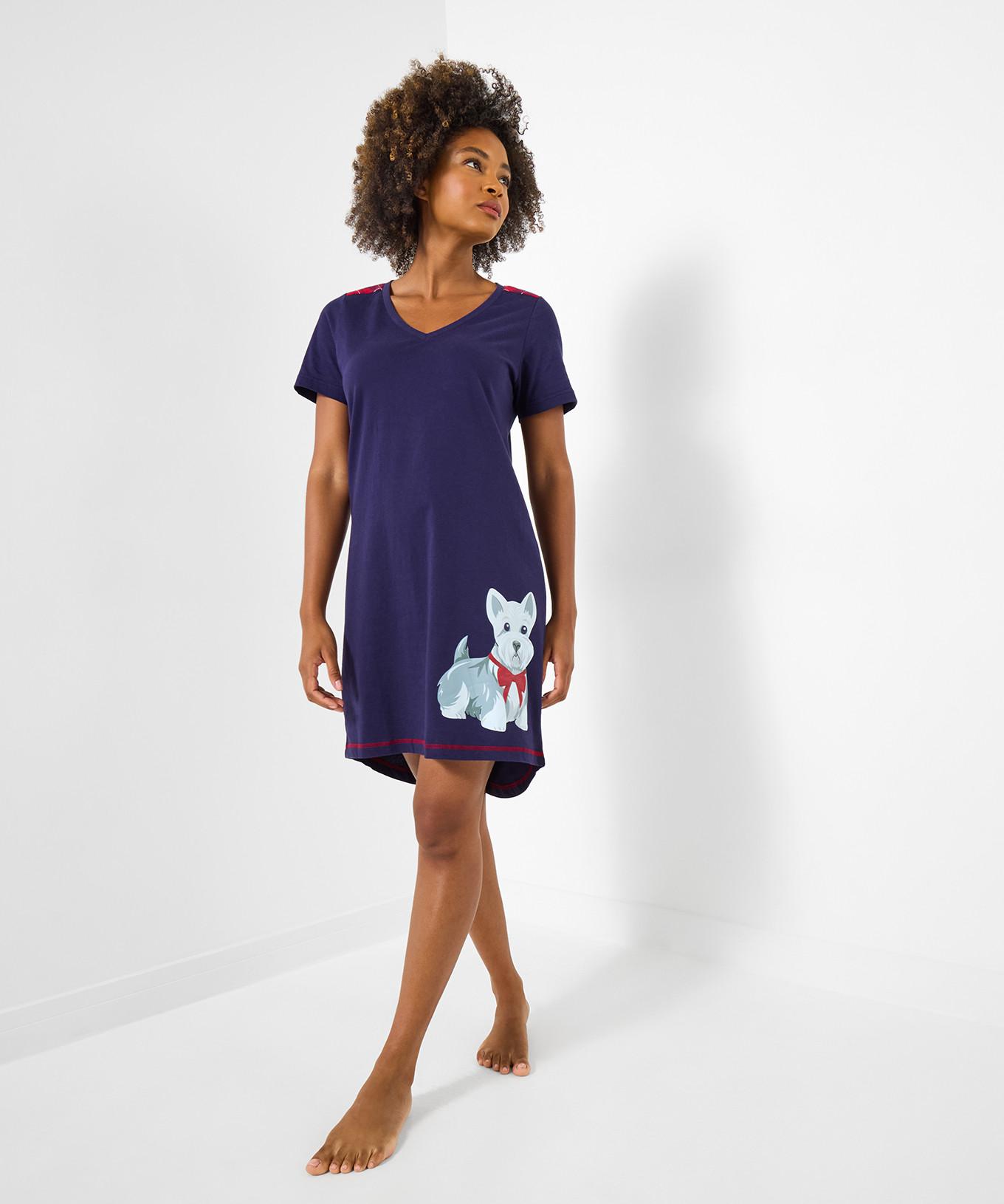Dieses bequeme Jersey-Nachthemd mit charmantem Hundeaufdruck verleiht der Nachtwäsche eine verspielte Note. Das Design umfasst einen V-Ausschnitt und kurze Ärmel, die eine entspannte Passform gewährleisten. Rote Zierleisten verbessern die Gesamtästhetik und machen es zu einer gemütlichen Wahl für kühlere Nächte.