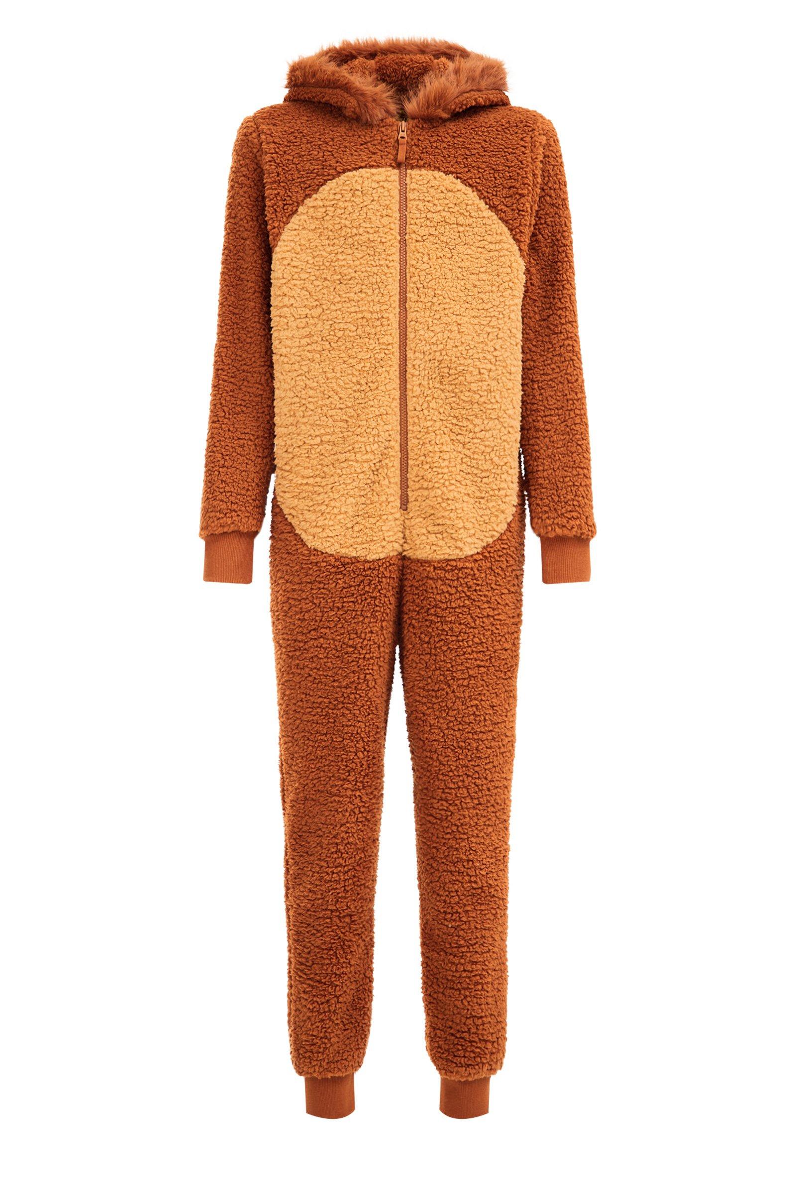 Normal geschnittener Anzug aus Teddyfleece mit langen Ärmeln, Kapuze mit Applikationen, Reißverschluss, zwei Eingrifftaschen, und langem Hosenbein.