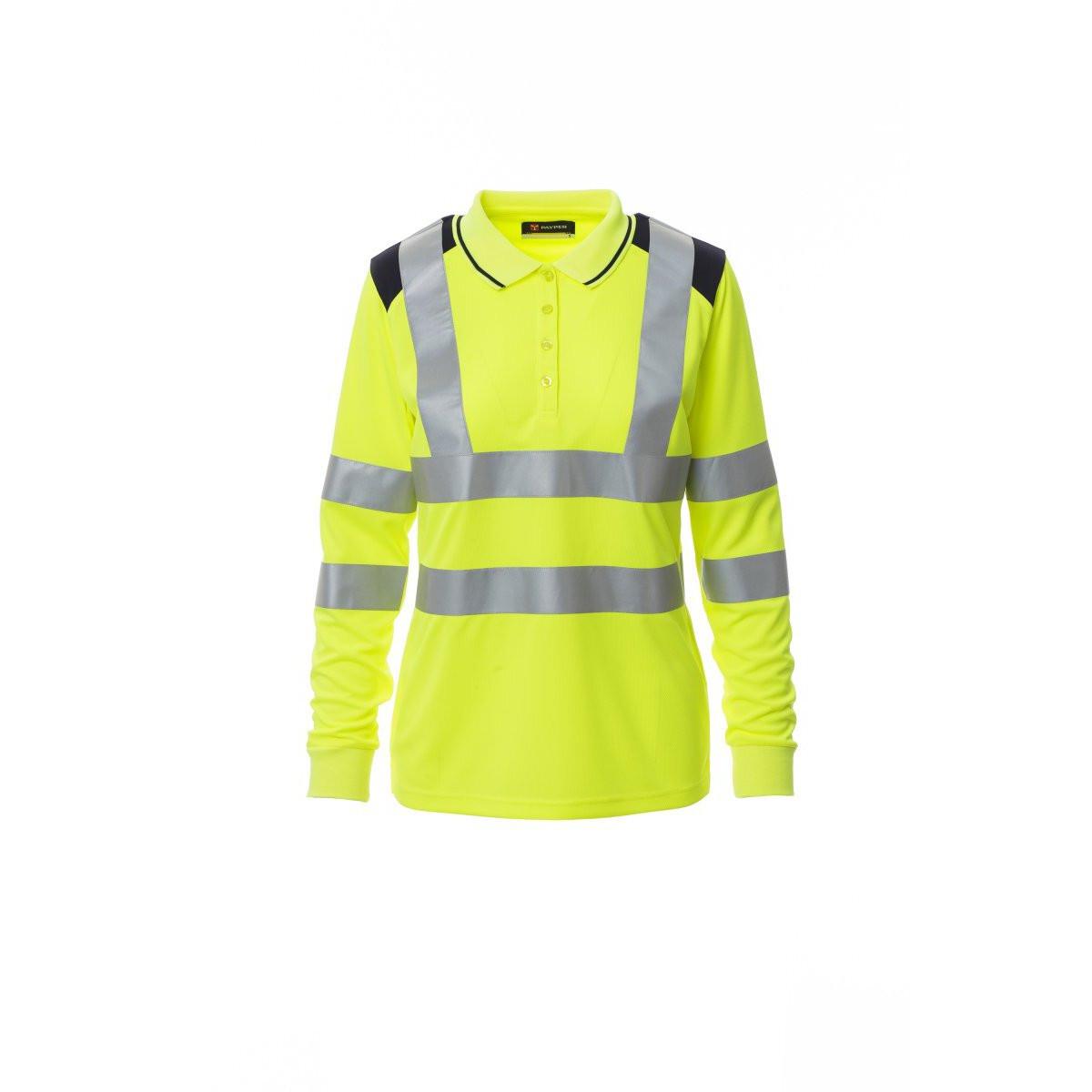 Dieses zweifarbige Langarm-Polohemd für Damen bietet hohe Sichtbarkeit mit reflektierenden Paspeln. Es verfügt über vier passende Knöpfe mit Perlmutt-Effekt, einen Kragen und Ärmelbündchen mit feinem Kontrastprofil, gerippten Kragen und Ärmelbündchen, Seitenschlitze und abgedeckte Kragennähte.
