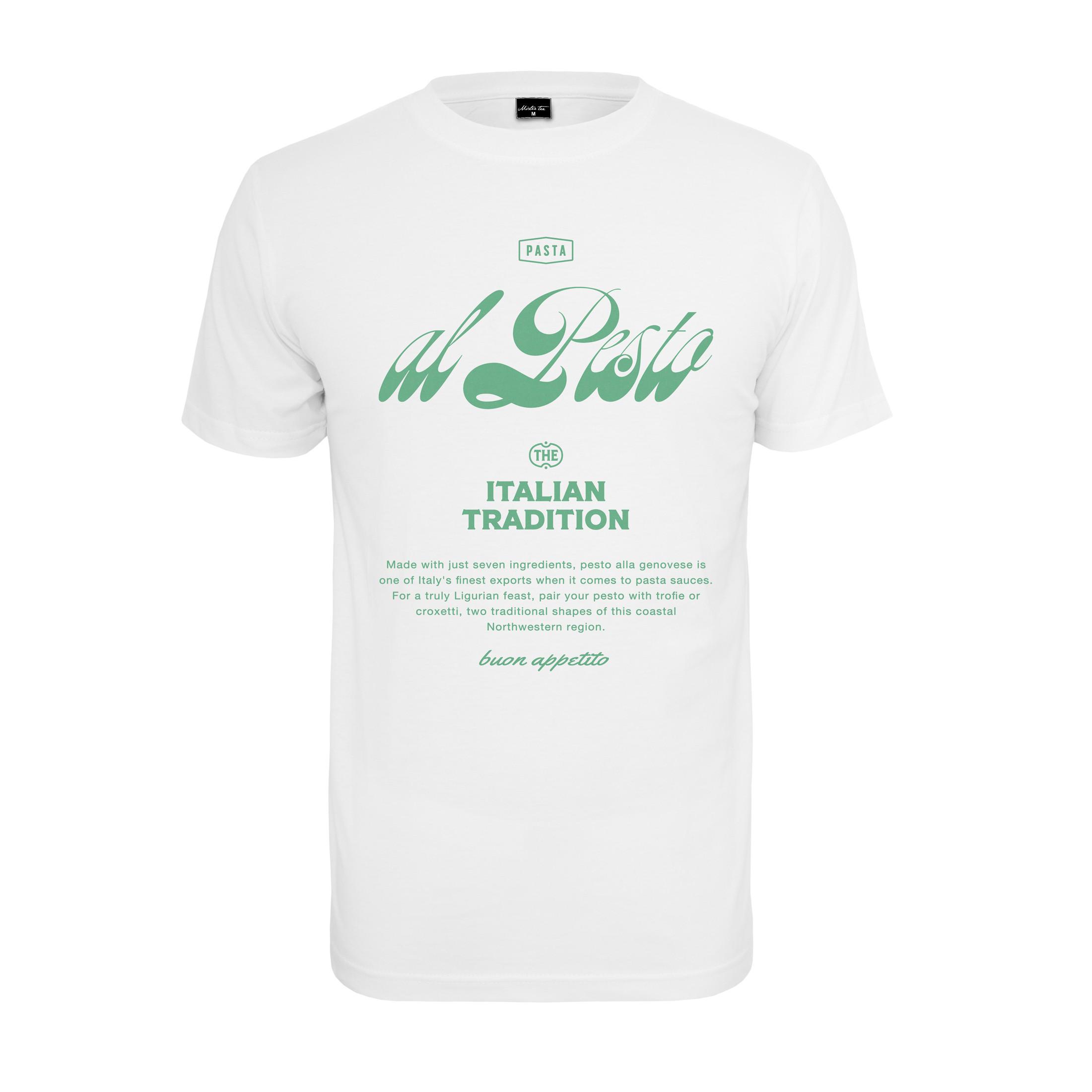 Dieses Urban Classic T-Shirt präsentiert sich in einem klassischen Design mit Rundhalsausschnitt und kurzen Ärmeln. Die Vorderseite des Shirts ist mit einem grafischen Aufdruck versehen, der "PASTA al Pesto THE ITALIAN TRADITION" sowie eine Beschreibung von Pesto und "buon appetito" zeigt.