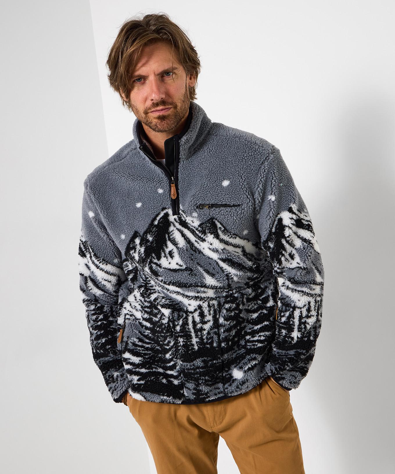 Diese Fleecejacke mit auffälligem Berg- und Waldprint ist eine unverwechselbare Ergänzung für jede Garderobe. Das Design umfasst einen Stehkragen und einen halben Reissverschluss, der sowohl Stil als auch Funktionalität bietet. Eine Brusttasche mit Reissverschluss bietet praktischen Stauraum für kleine Essentials.
