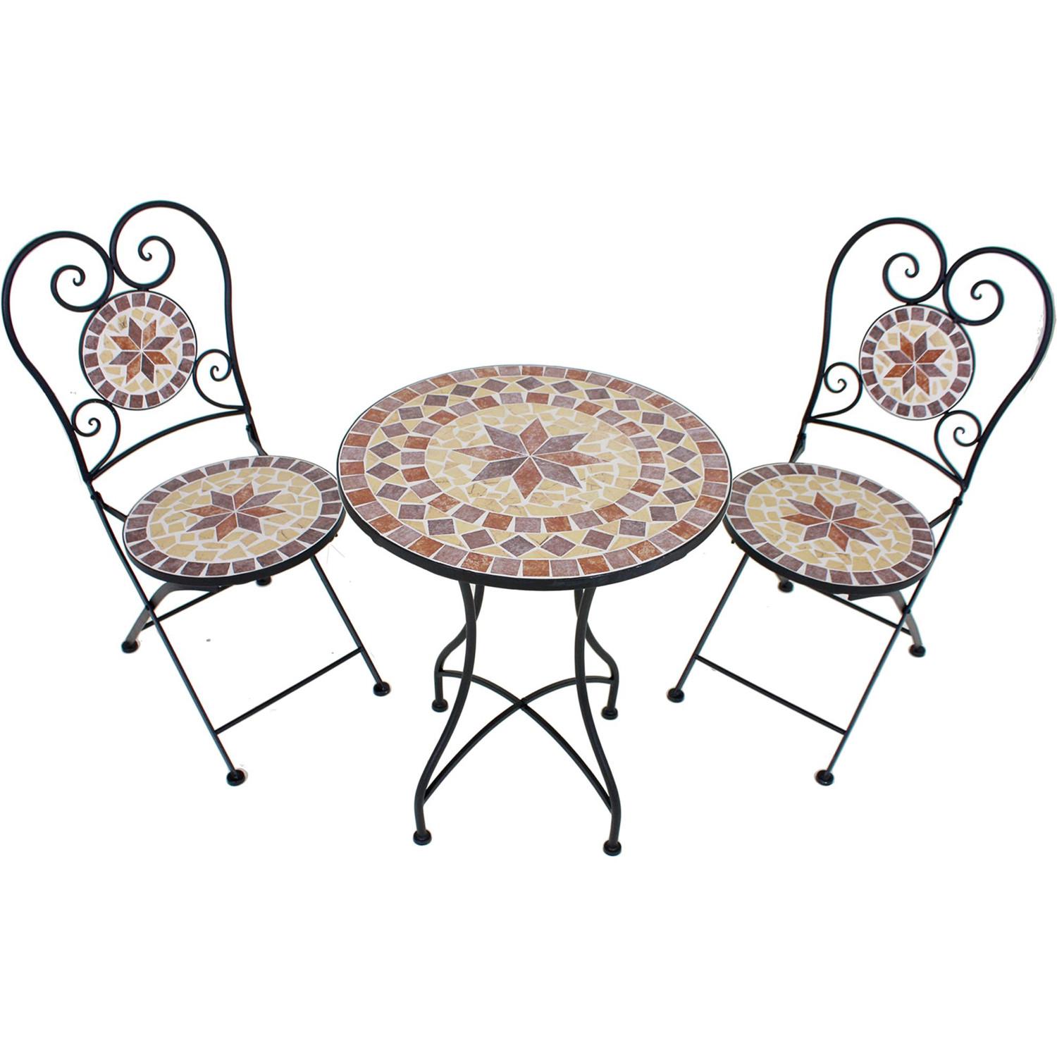 Verwandeln Sie Ihren Aussenbereich mit unserem Balkonset Amarillo, das aus zwei Stühlen und einem Tisch in klassisch mediterranem Stil besteht. Dieses Set besticht durch sein dekoratives Mosaik aus keramischem Steingut in der Tischplatte, den Sitzflächen und der Rückenlehne. Die kunstvoll sternförmig eingearbeiteten Steingutscheiben in sandfarben von beige bis zu roten Ockertönen, kontrastiert mit dem geschwungenen schwarzen Stahlgestell, machen dieses Set zu einem äusserst dekorativen Blickpunkt in Ihrem grünen Paradies.