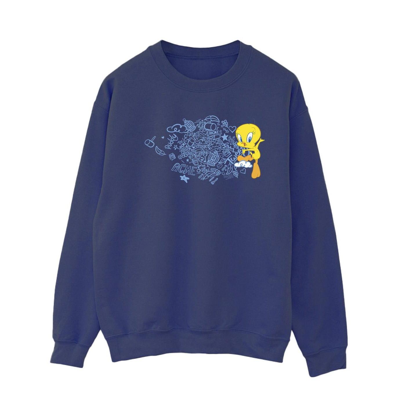 Dieses Sweatshirt zeigt eine verspielte Grafik von Tweety Bird, umgeben von verschiedenen ACME-inspirierten Kritzeleien. Das Design verleiht einem klassischen Kleidungsstück einen Hauch von Spass und Nostalgie.