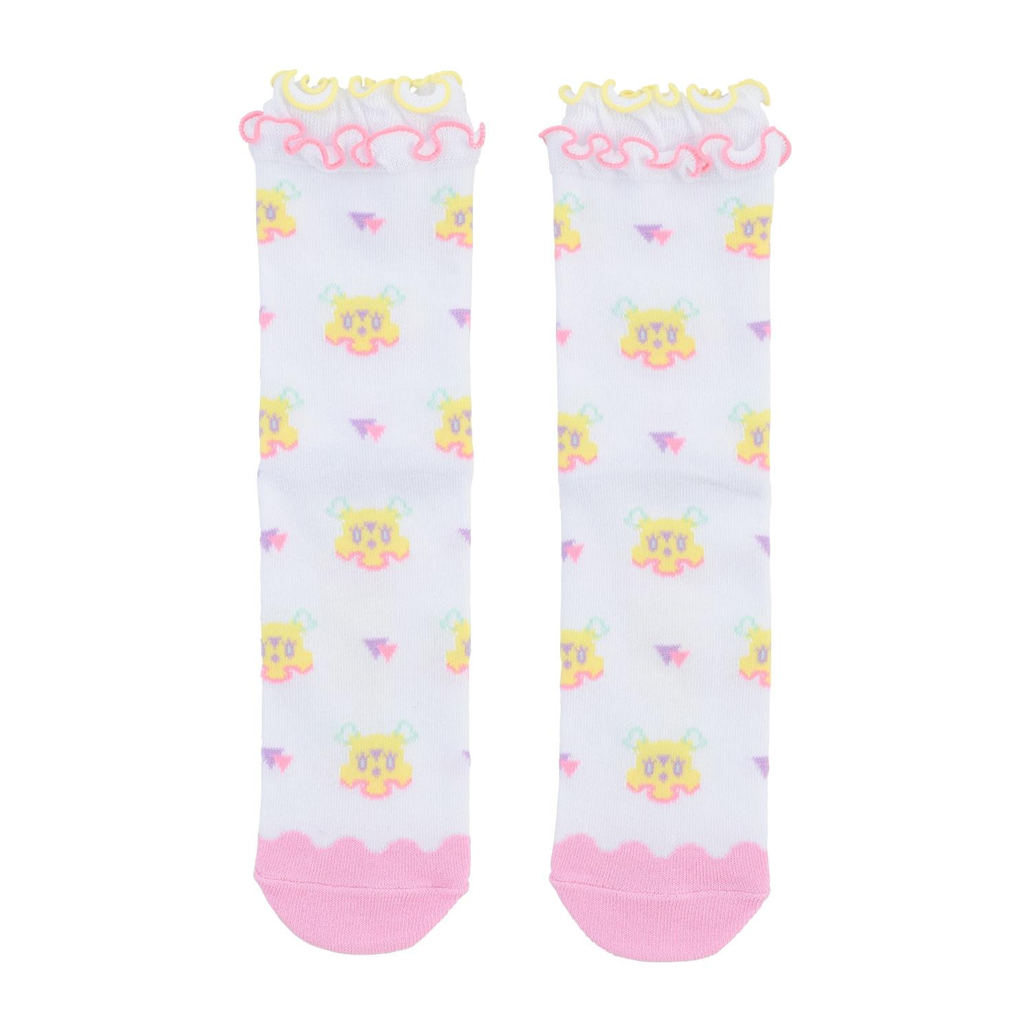 Diese Socken zeigen ein verspieltes Muster mit niedlichen Tiergesichtern und geometrischen Formen, die jedem Outfit eine lustige Note verleihen. Der Rüschenbund und die kontrastierende Spitze und Ferse runden das charmante Design ab.
