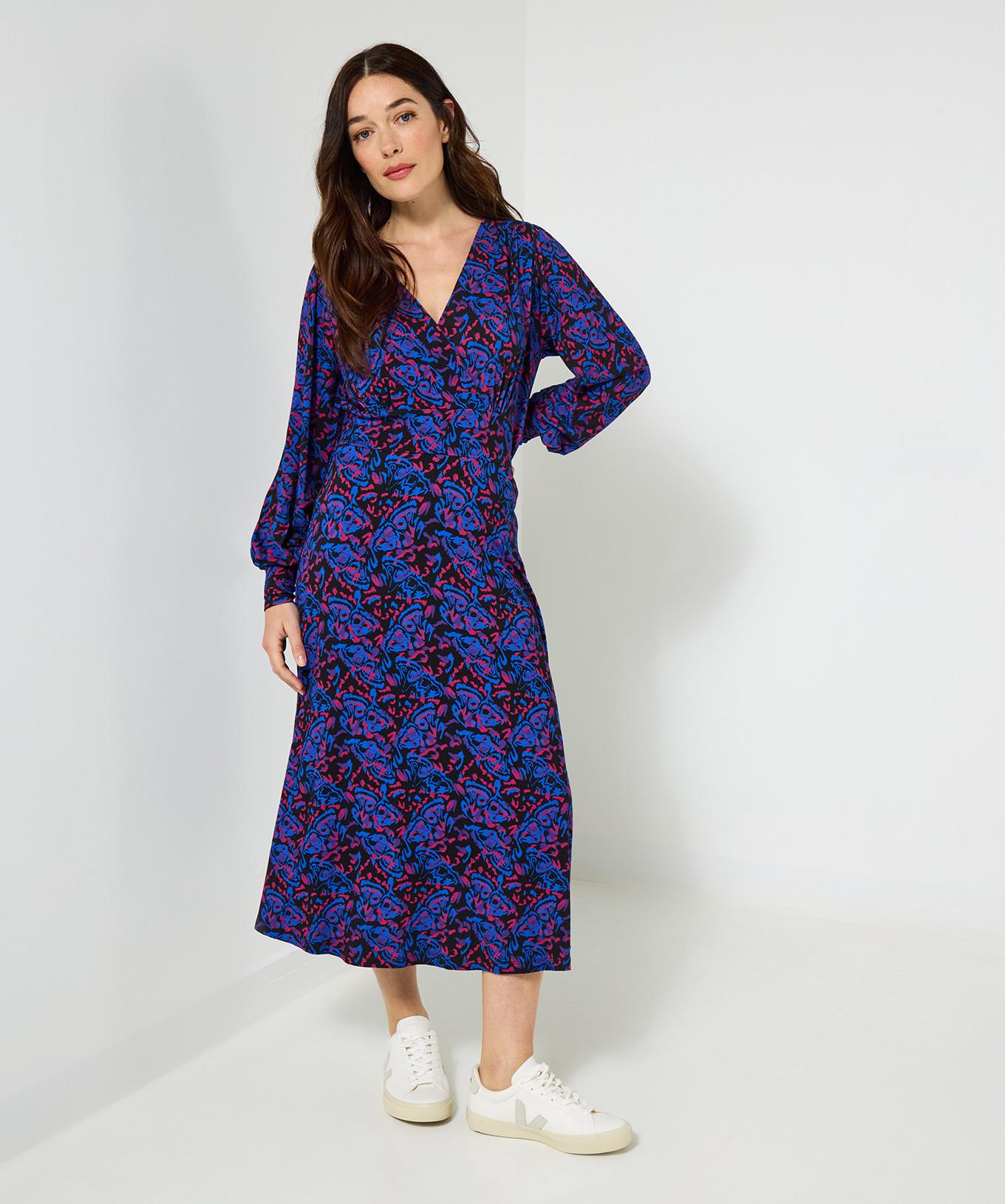 Dieses Jersey-Midikleid präsentiert sich mit einem lebhaften Schmetterlingsmuster und bietet eine stilvolle sowie bequeme Option für verschiedene Anlässe. Das Design umfasst einen schmeichelhaften V-Ausschnitt und lange Ärmel mit elastischen Bündchen, die eine schicke Silhouette schaffen.