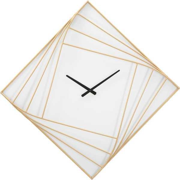 Elegante quadratische Wanduhr aus goldenem Metall mit einfachem, geometrischem Design. Hypnotische Linien, die zu einer raffinierten optischen Täuschung verschmelzen. Die Uhr wird mit 1xAA Batterie betrieben (nicht inklusive).