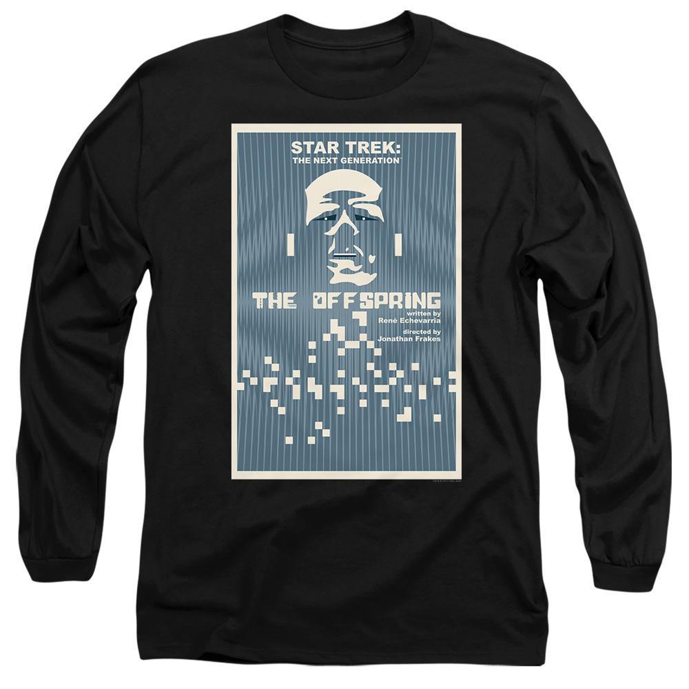 Dieses Langarm-T-Shirt zeigt einen Grafikdruck, der von "Star Trek: The Next Generation" Staffel 3 Episode 16, "The Offspring", inspiriert ist. Das Design zeigt eine stilisierte Darstellung von Datas Gesicht vor einem blauen Hintergrund mit pixeligen Elementen und enthält die Credits für den Autor und Regisseur der Episode.
