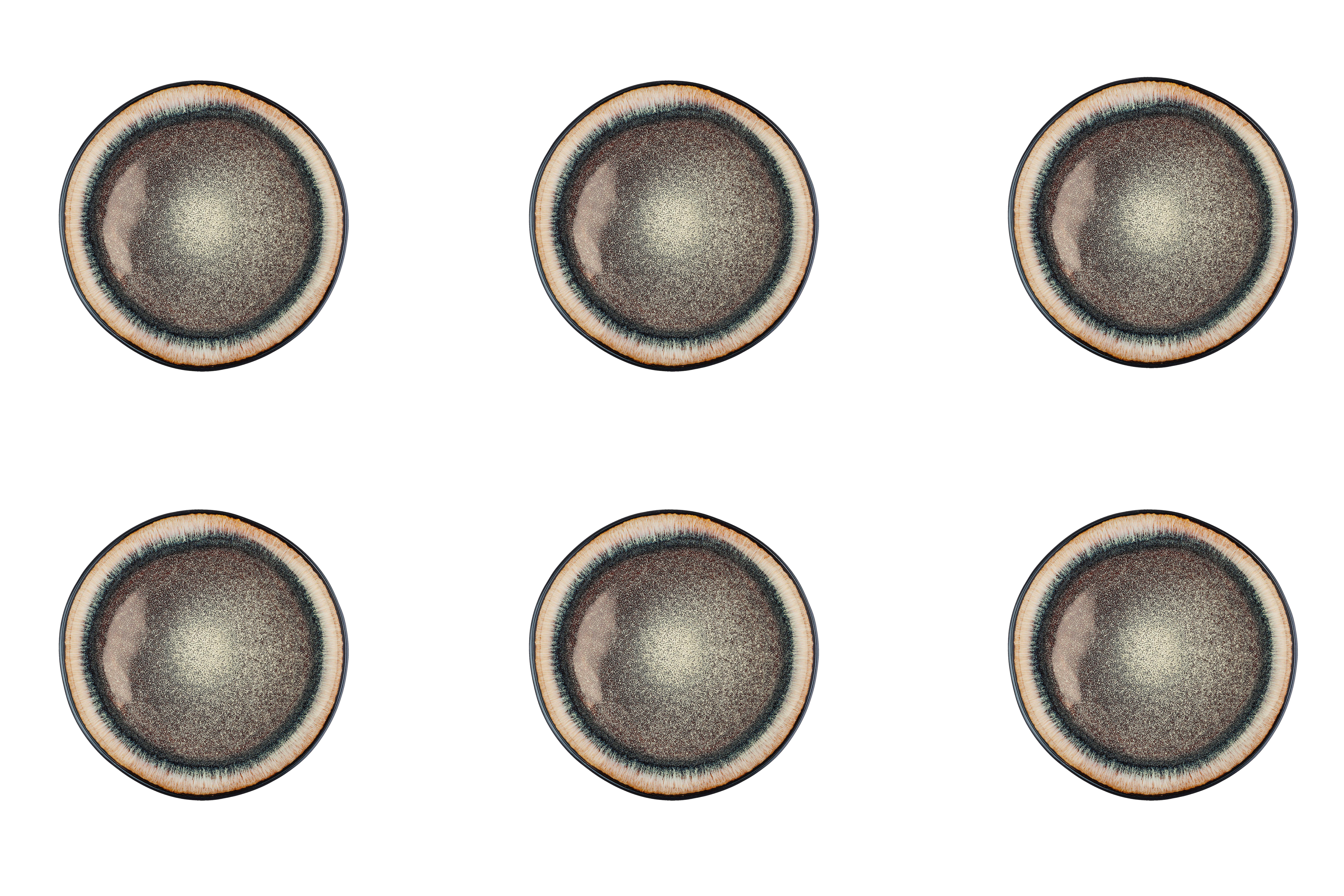 Enthält: 6 Teller Ø21,5 cm REACTIV-Kollektion / IRIS-Reihe / WILD BROWN-Version Hergestellt aus Steingut mit reaktiver Glasur Farbe: Beige-Braun-Verlauf Spülmaschinen-, mikrowellen- und ofenfest (180°C) Abmessungen eines Stücks (L x B x H) 21,5 x 21,5 x 2,5 cm Geliefert in bruchsicherer Verpackung