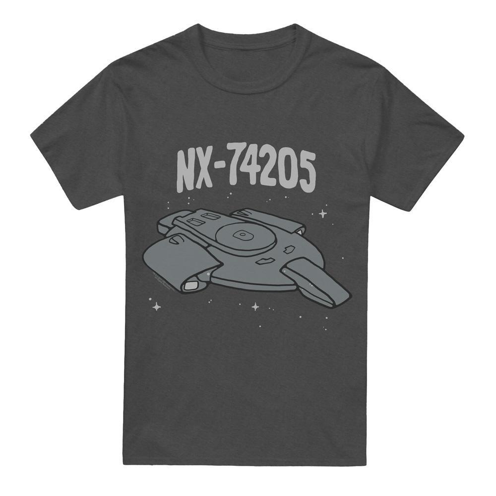 Dieses T-Shirt zeigt einen grafischen Druck eines Raumschiffs mit der Bezeichnung NX-74205 und ist somit eine unverwechselbare Ergänzung für jede Freizeitgarderobe. Das Design ist auf der Vorderseite zentriert und bietet eine klare visuelle Aussage.