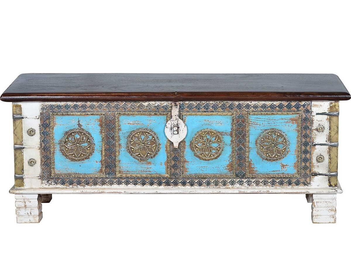 Truhe aus Mangoholz mit Bronze Details und grossem Fassungsvermögen.