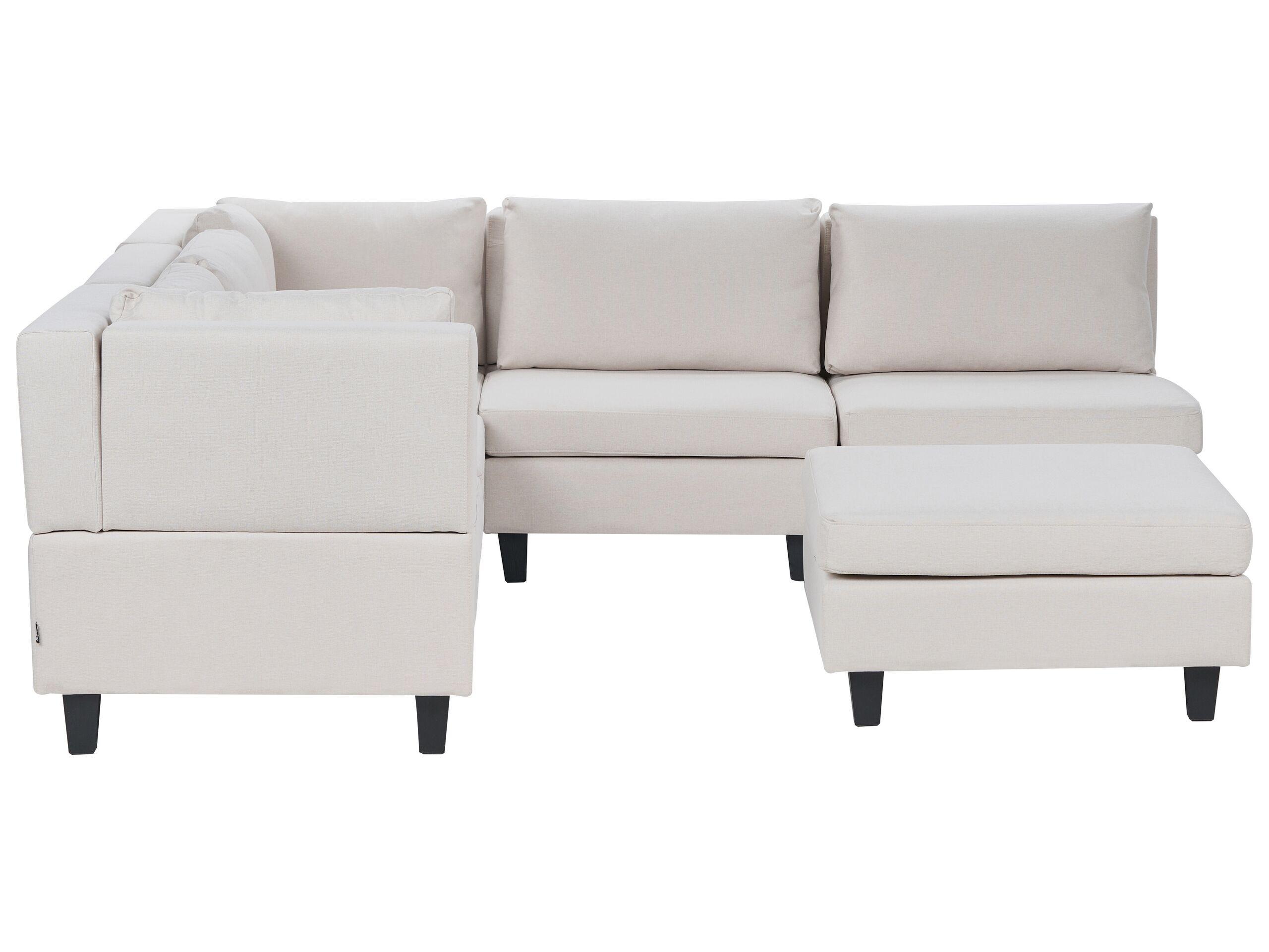 Rechtsseitiges 5-Sitzer Modul-Ecksofa mit hellbeigem Stoffbezug und passender Ottomane. Kreieren Sie einen traumhaften Wohnbereich nach eigenen Wünschen. Die Sitzplätze kann man miteinander verbinden, um ein 5-Sitzer Sofa zu erschaffen oder man kann das multifunktionale Sessel-Modul und die passenden Eckmodule als eigenständige Möbelstücke nutzen. Die weiche Polsterung auf den Sitz- und Rückenkissen sorgt für ein herrliches Sitzgefühl, so dass Sie jede freie Minute mit Vergnügen auf dem Modulsofa verbringen werden. Fügen Sie zusätzliche Deko-Kissen hinzu, um sich einen gemütlichen Entspannungsbereich für besonders bequeme Fernsehabende zu schaffen.