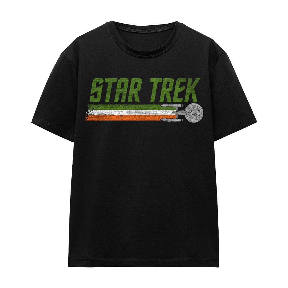 Dieses Star Trek T-Shirt präsentiert ein einzigartiges Design, das das ikonische Star Trek Logo mit den Farben der irischen Flagge kombiniert und so einen unverwechselbaren und stilvollen Look schafft. Die Grafik zeigt die USS Enterprise und ist somit ein perfektes Kleidungsstück für Fans der Serie.