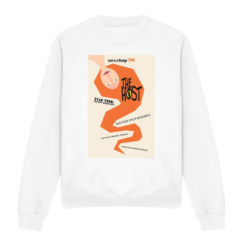 Dieses Sweatshirt zeigt einen einzigartigen Grafikdruck, inspiriert von der "The Host"-Episode aus Star Trek: The Next Generation Staffel 4. Das Design fängt die Essenz der Episode mit einer stilisierten Illustration und Text ein und macht es zu einem unverwechselbaren Stück für Fans.
