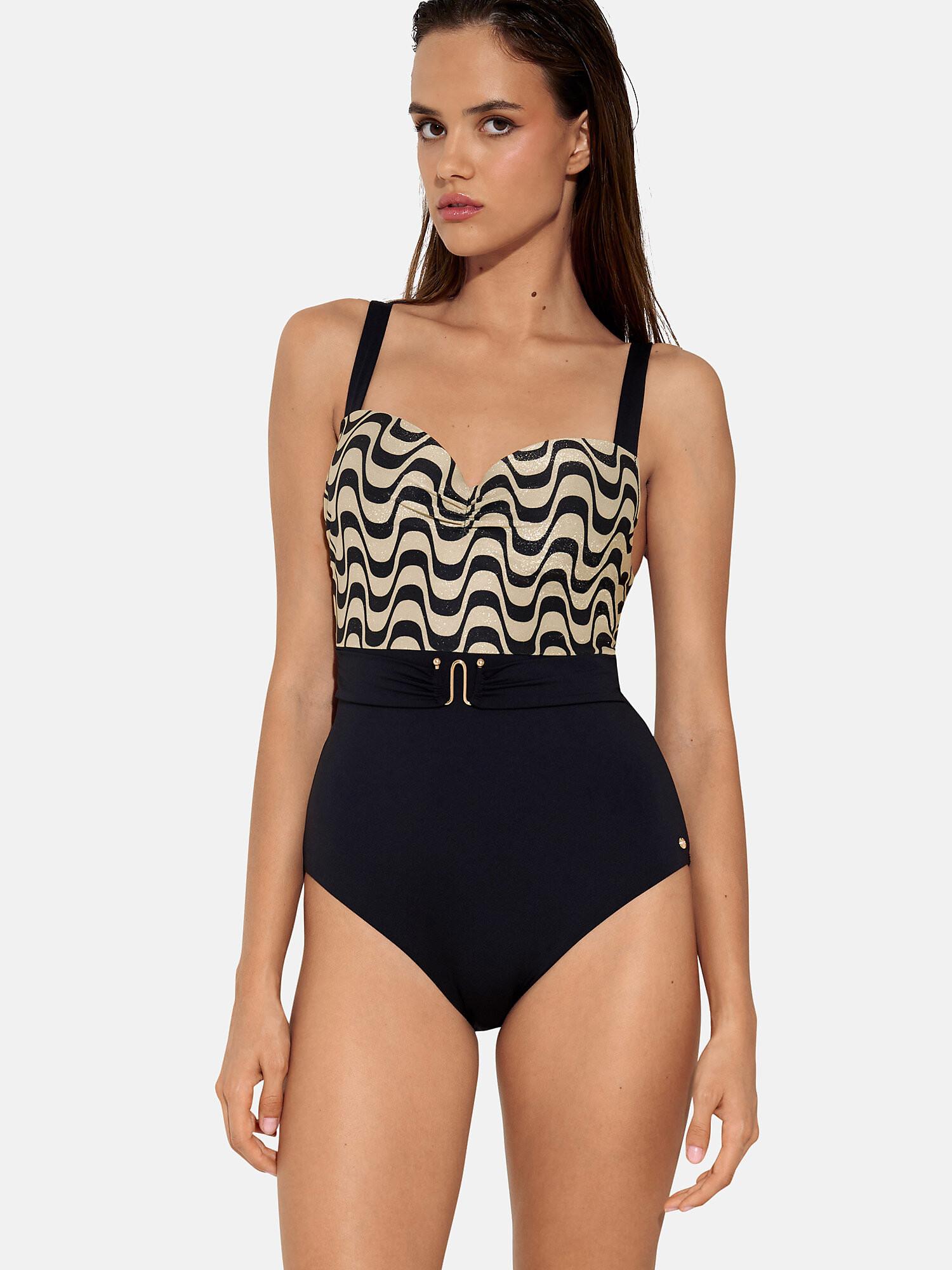 Die elegante zweifarbige Serie bietet eine raffinierte Kombination aus zweifarbigem Wellenprint und feinen, monochromen Metallfäden, die dezent miteinander verwoben sind. Der Vintage-Druck wird die Anhänger des eleganten Retro-Stils begeistern, und gleichzeitig ist dieses Material recycelt. Die gewellten Schnallen in Gold und Silber passen perfekt zum Druck der abgebildeten Stücke und verleihen ihnen einen eleganten und glamourösen Look. Erhältlich in der Kombination Schwarz und Beige mit einer goldenen Schnalle und in der etwas kräftigeren Kombination Flamingo-Orange-Pink-Weiss-Silber mit einer silbernen Schnalle. Dieser Badeanzug ist für alle Frauen, die ihren Stil und ihre Weiblichkeit am Strand oder am Pool unterstreichen wollen.