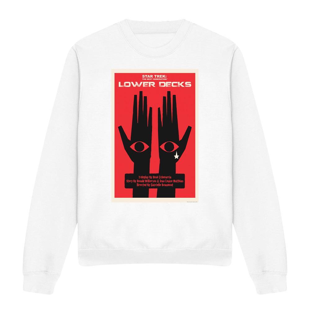Dieses Sweatshirt zeigt einen einzigartigen Grafikdruck, inspiriert von "Star Trek: The Next Generation" Staffel 7 Episode 15. Das Design präsentiert zwei Hände mit Augen auf den Handflächen vor einem auffälligen roten Hintergrund und ist somit ein unverwechselbares Stück für Fans.
