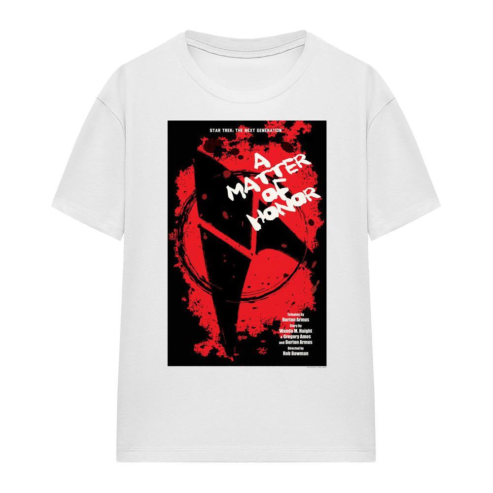 Dieses T-Shirt zeigt einen Grafikdruck, der von "A Matter of Honor", Staffel 2 Episode 8 von Star Trek: The Next Generation, inspiriert ist. Das Design fängt die Essenz der ikonischen Episode ein und macht es zu einem unverwechselbaren Stück für Fans.