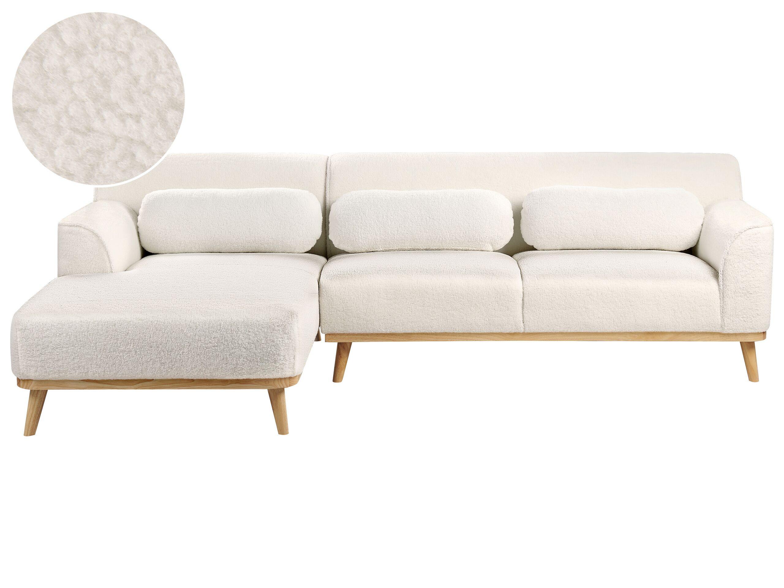 3-Sitzer Sofa mit rechtsseitiger Chaiselongue, mehreren Kissen und hohen Holzbeinen. Dieses L-förmige Sofa bringt sowohl Gemütlichkeit als auch einen sagenhaften Retro-Look in jeden modernen Wohnbereich. Dabei besticht es mit seinem strapazierfähigen Rundumbezug aus üppigem Bouclé-Stoff, der nicht nur eine optische, sondern auch eine haptische Freude mit sich bringt. Die Verbindung des dezenten Farbtons des Stoffbezugs mit den hellen Holztönen des Gestells erlaubt es Ihnen, das Sofa mit jeder Einrichtung zu kombinieren und diese zu beleben. Grosszügig mit zusätzlichen Kissen und einer breiten Chaiselongue ausgestattet, definiert diese Couch die Kunst der Entspannung garantiert neu.