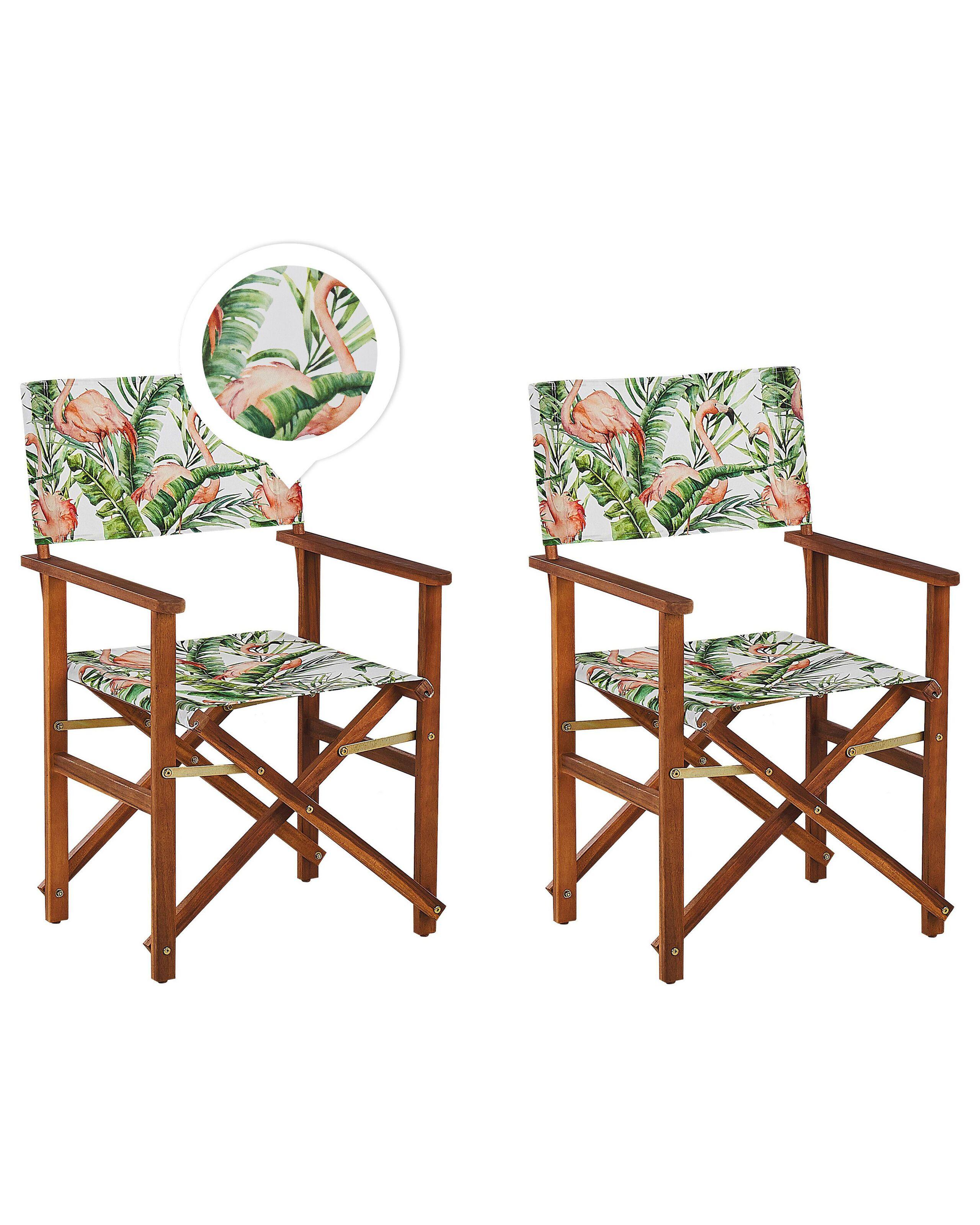 Outdoor-Regiestühle aus Holz mit 2 wechselbaren Stoffbezügen mit Flamingo-Motiv. Ob im Wohnzimmer oder im Garten platziert – dieses Set wird Ihrem Zuhause garantiert ein Hollywood-Feeling verleihen. Das Gestell ist aus langlebigem und robustem Akazienholz in naturbelassener Ausführung gefertigt, welches den zeitlosen Stil unterstreicht. Im Lieferumfang sind zwei Regiestühle mit jeweils einem Standardbezug in Grau, sowie 2 zusätzliche farbenfrohe Alternativstoffe mit Flamingomuster enthalten. So haben Sie die Möglichkeit, die Sitzgelegenheiten nach Belieben zu verändern und für Abwechslung zu sorgen. Wenn Sie die Stühle Mal nicht brauchen, können Sie sie leicht zusammenklappen und so Platz sparen.