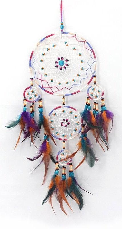 - Handgemachter Traumfänger mit 5 Reifen, Perlen und Federn.