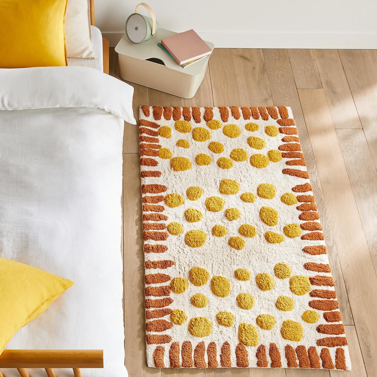 Der Bettvorleger Aarav ist besonders dicht, weich und flauschig. Seine Motive in lebhaften Farben auf naturfarbenem Grund erinnern an das gefleckte Fell mancher Tiere.