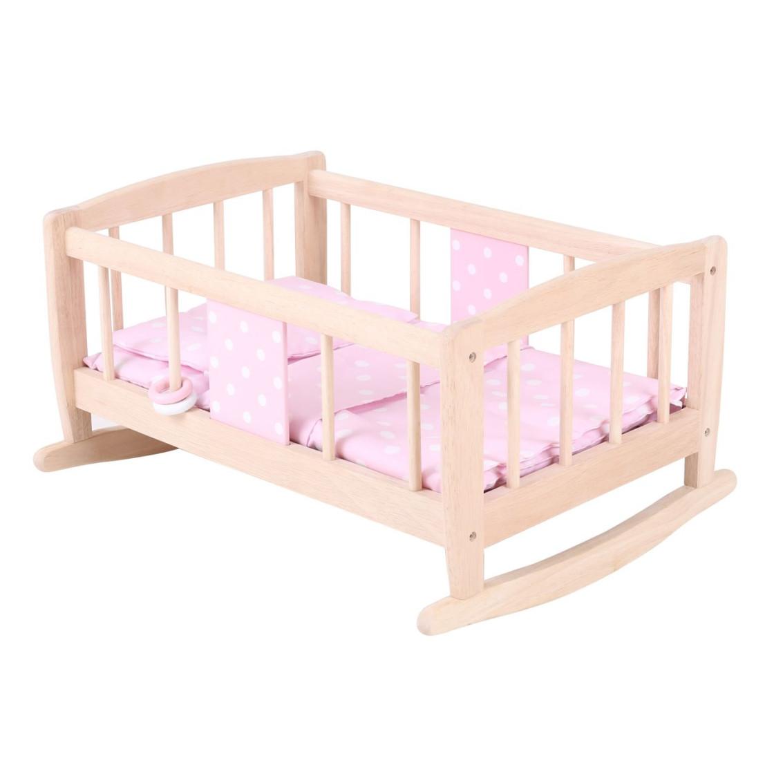 Diese bezaubernde Puppenwiege ist das ideale Spielzeug für kleine Puppeneltern. Sie misst 53 x 36 x 28 cm und besteht aus hochwertigem Kautschuk-Holz. Mit ihrer ansprechenden Lackierung sowie den rosa gemusterten Decken und Kissen zieht sie alle Blicke auf sich. Das enthaltene Zubehör ermöglicht sofortigen Spielspass.