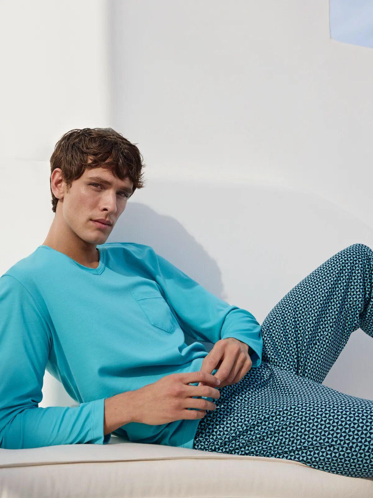 Der Relax Streamline Pyjama bietet Komfort und Stil zum Entspannen oder Schlafen. Dieses maskuline und hochwertige Set besteht aus einem unifarbenen Langarm-Shirt mit V-Ausschnitt und aufgesetzter Brusttasche, kombiniert mit einer gemusterten langen Hose mit stoffbezogenem Komfortbund.