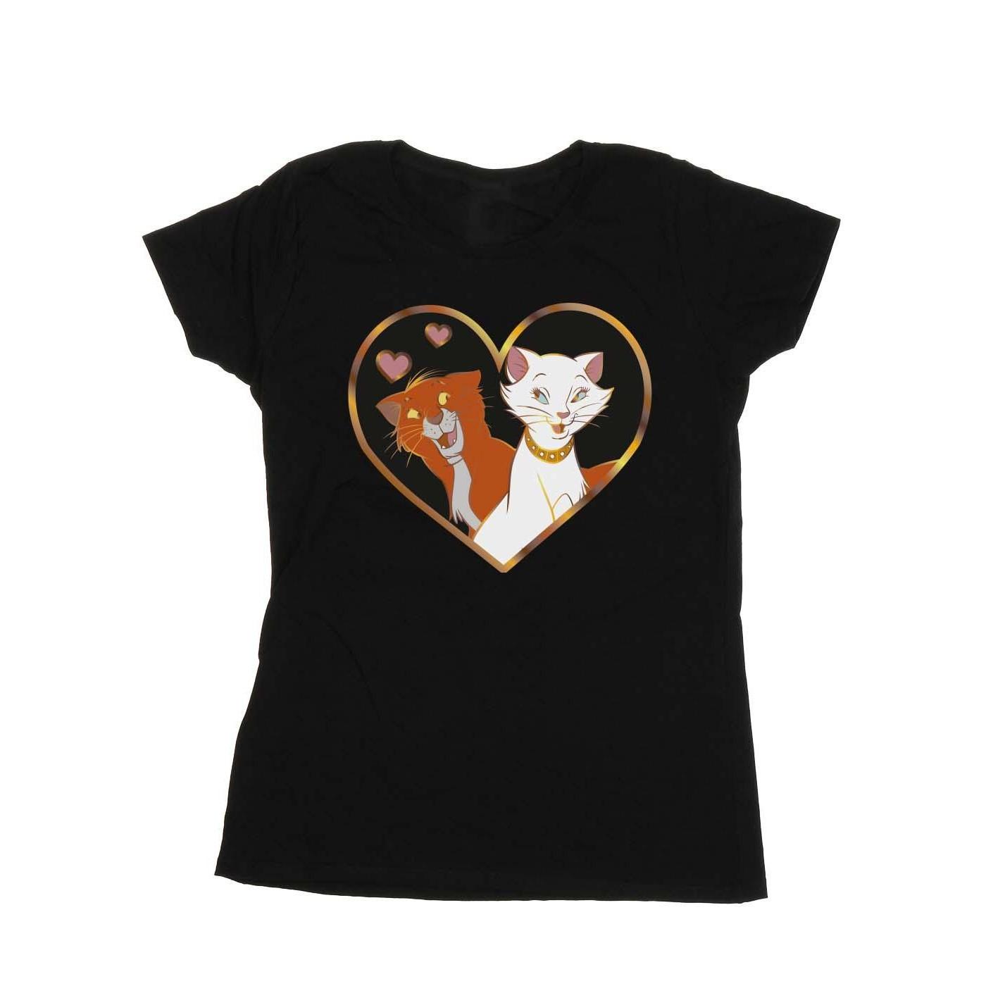 Dieses T-Shirt zeigt eine charmante Grafik von Duchess und Thomas O'Malley aus Disneys The Aristocats, umrahmt von einer herzförmigen Kontur. Das Design fängt die geliebten Katzenfiguren in einer süssen Umarmung ein und ist eine entzückende Ergänzung für jede Garderobe.