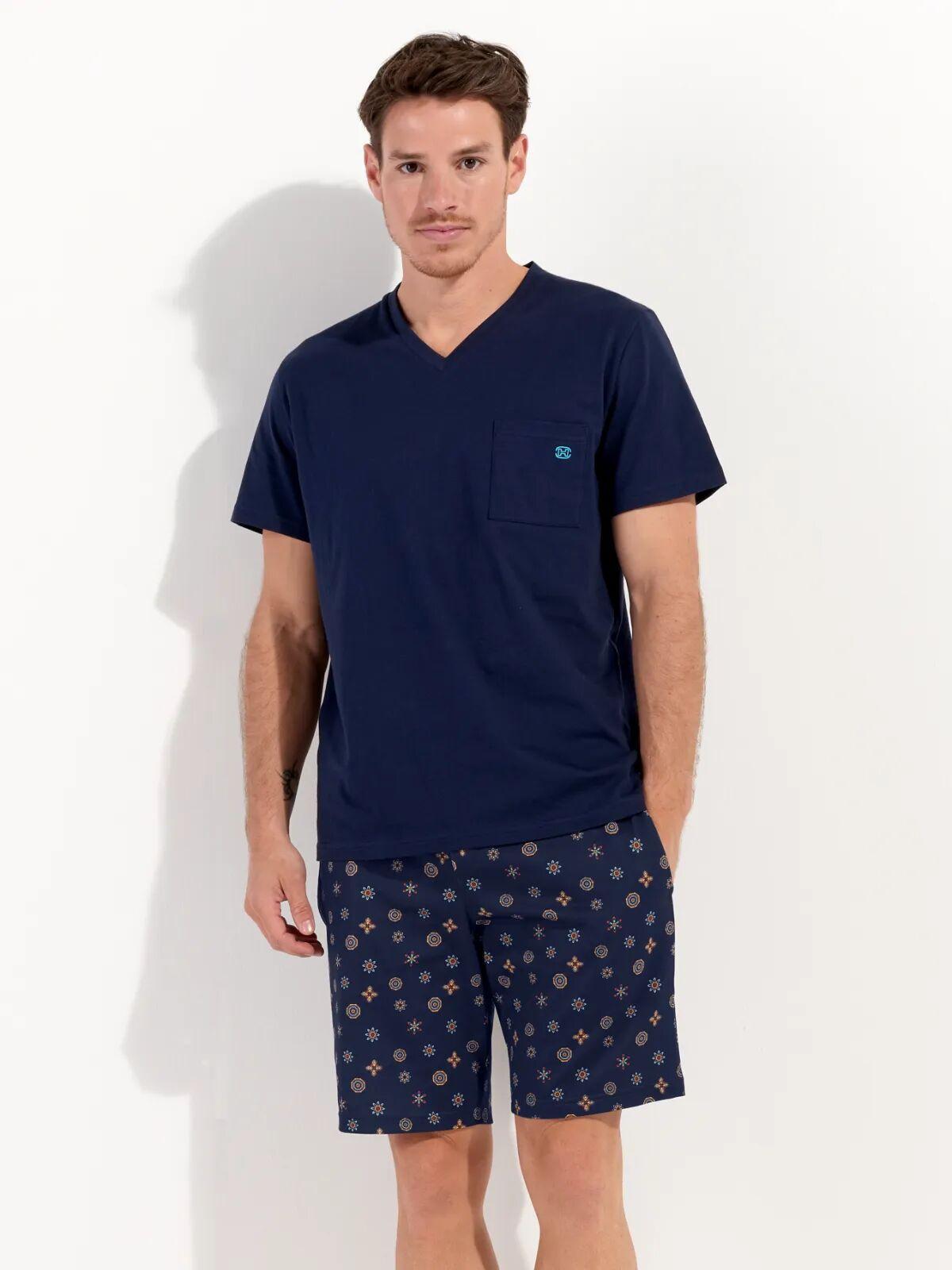 Dieses bequeme Pyjama-Set besteht aus einem kurzärmeligen Oberteil und gemusterten Shorts, perfekt zum Entspannen zu Hause. Das Oberteil verfügt über einen V-Ausschnitt und eine aufgesetzte Brusttasche mit gesticktem Logo, die einen stilvollen Akzent setzt. Die Shorts sind mit einem lebhaften, durchgehenden geometrischen Muster verziert, was dieses Set sowohl gemütlich als auch optisch ansprechend macht.