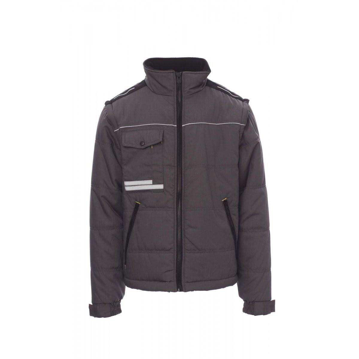 Diese Herren-Blousonjacke verfügt über abnehmbare Ärmel und einen konturierten Rücken. Sie ist mit einem 8 mm Kunststoffreissverschluss mit Metallschieber und einer einziehbaren Kapuze ausgestattet. Die Jacke umfasst zwei grosse externe Reissverschlusstaschen, eine geräumige multifunktionale Brusttasche und einen Smartphone-Halter. Reflektierende Paspeln und ein Ausweishalterring sind ebenfalls integriert. Das Innere ist gesteppt mit einem hochdichten Futter, einem Fleecekragen und einer Innentasche.