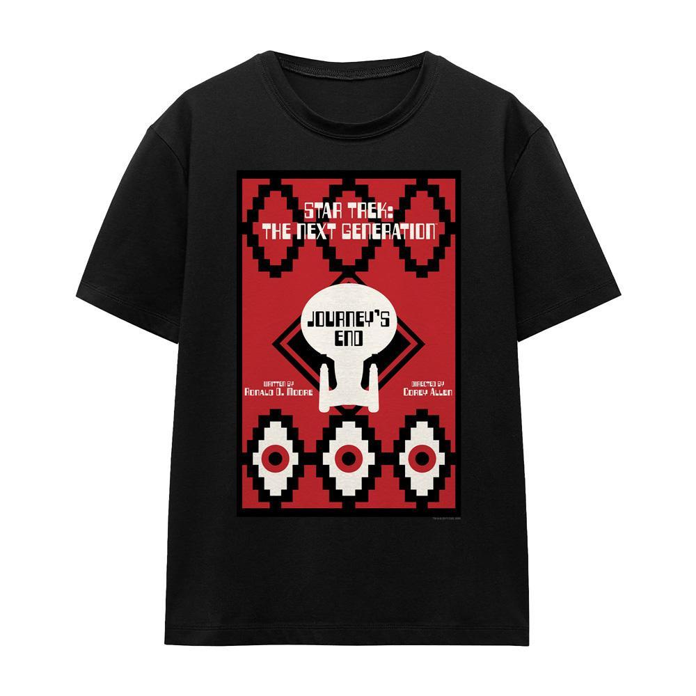 Dieses T-Shirt zeigt einen Grafikdruck, inspiriert von "Star Trek: The Next Generation" Staffel 7 Episode 20, mit dem Titel "Journey's End". Das Design fängt die Essenz der ikonischen Science-Fiction-Serie mit einer einzigartigen künstlerischen Interpretation des Episodentitels und der Credits ein.