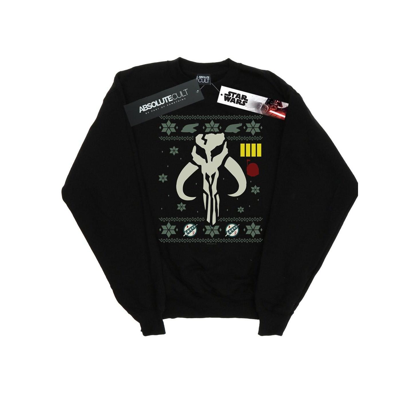 Dieses Sweatshirt präsentiert ein festliches Design, inspiriert von der ikonischen Star Wars Serie. Es zeigt den Mythosaur-Schädel, ein Symbol der mandalorianischen Kultur, integriert in ein weihnachtliches Muster.