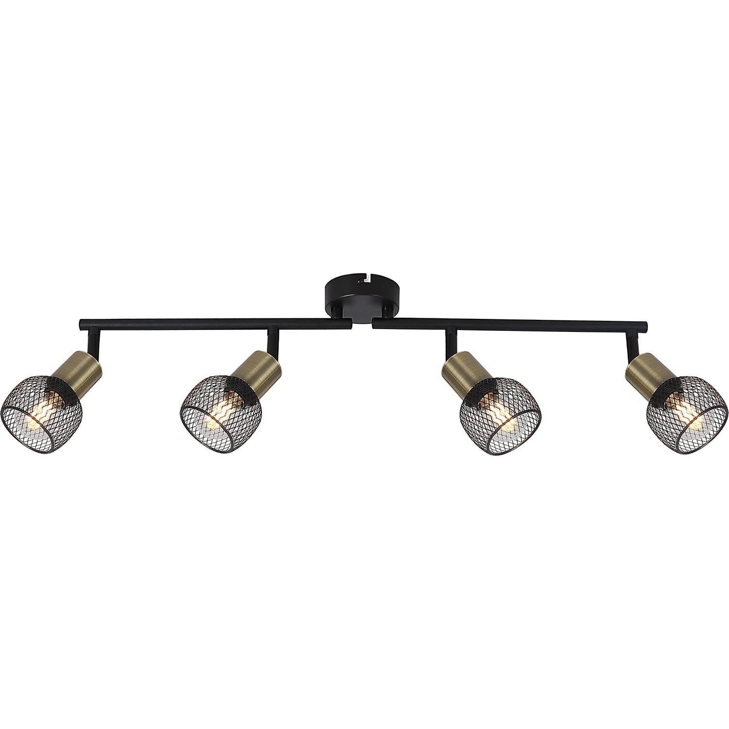 Dieser Deckenstrahler aus der Fiastra-Serie überzeugt durch sein elegantes Design aus schwarz-mattem Metall und Altmessing. Die vier Metallgitterschirme können mit je einem E14-Leuchtmittel Ihrer Wahl bestückt werden, die dann in die mit wunderschönem Altmessing umrahmten Fassungen kommen. Dadurch haben Sie die Möglichkeit, Lichtfarbe und Helligkeit nach Belieben zu bestimmen und können für ein stilvolles Ambiente in Ihren Innenräumen sorgen.