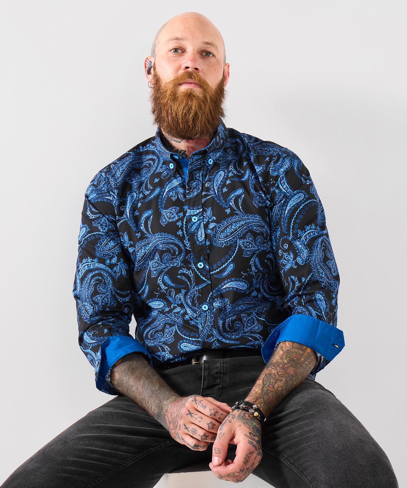 Dieses langärmelige Hemd präsentiert ein auffälliges Paisleymuster, das einen unverwechselbaren und stilvollen Look bietet. Das Design umfasst einen klassischen Kragen und einen Knopfverschluss, was es zu einer vielseitigen Ergänzung für jede Garderobe macht.