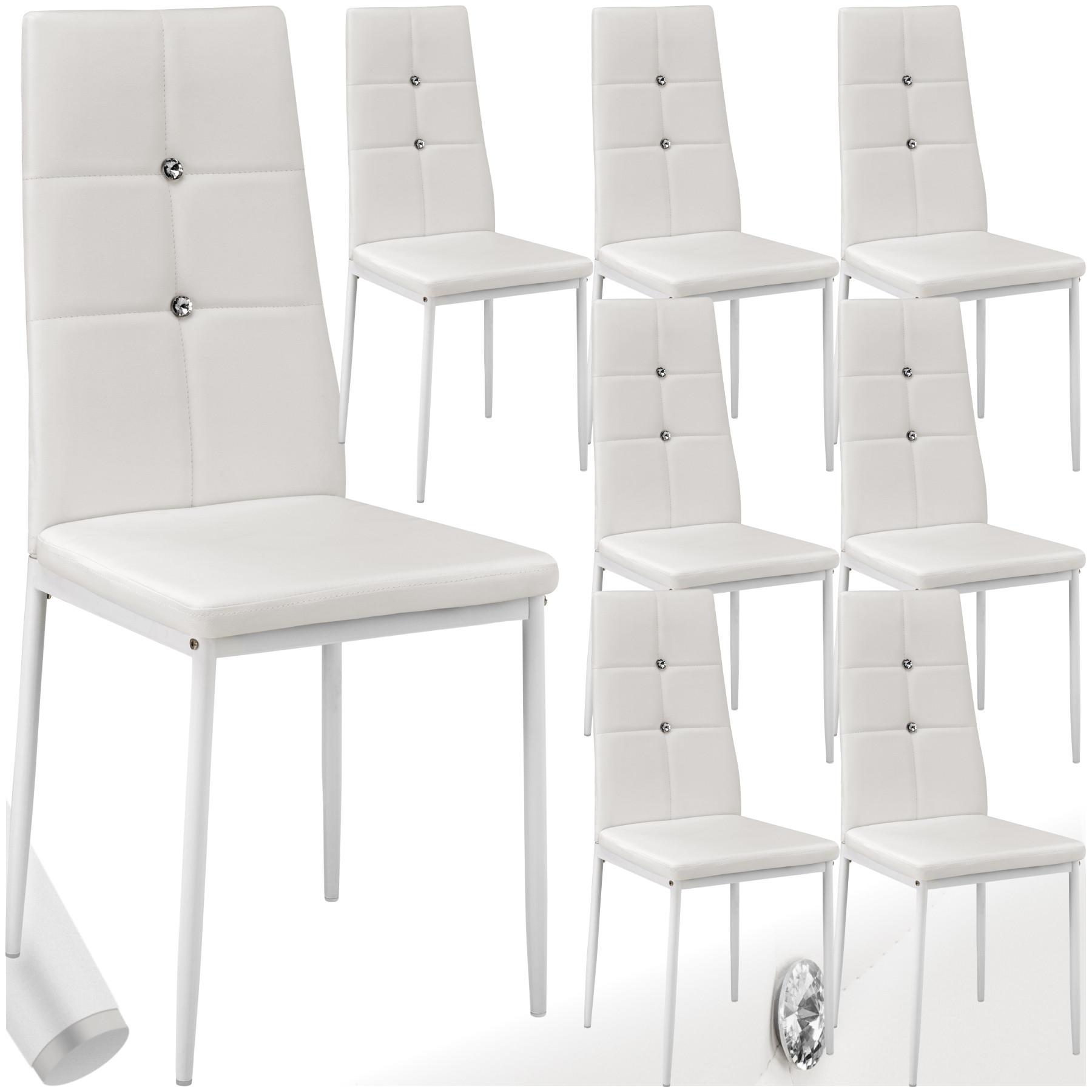 Setze einen stilvollen Akzent in Deiner Küche mit diesem 8er Set Esszimmerstühle von tectake. Die Sitzgruppe verbindet ein schickes Erscheinungsbild mit praktischen Eigenschaften. Ein hoher Sitzkomfort, ein strapazierfähiges Kunstleder und eine einfache Reinigung zeichnen diese Hochlehner aus. Trotz der schlanken Form und des geringen Gewichts sind die Polsterstühle äußerst stabil und belastbar. Der Eyecatcher sind natürlich die beidseitig eingearbeiteten Steine in Diamantenoptik, die dem Designer-Stuhl den besonderen Touch geben. Auch außerhalb des Essbereichs macht der Sitz eine gute Figur und lädt zum Verweilen ein. Bringe trendbewusstes Design in Deine vier Wände mit dem 8er Set Esszimmerstühle von tectake.