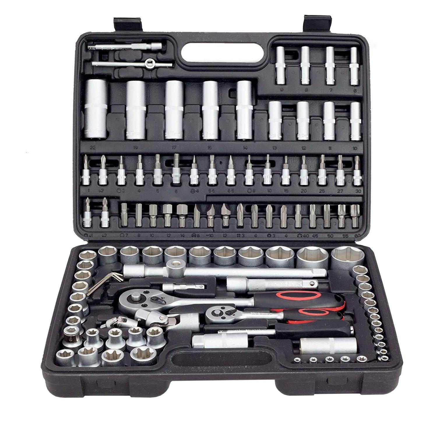 Mit diesem kompletten Steckschlüssel in der Garage müssen Sie nicht mitten in einem Projekt zum Geschäft laufen, da Ihnen die richtigen Werkzeuge fehlen. Mit 108 verschiedenen Teilen enthält es fast alles, was Sie für die meisten Heimprojekte benötigen könnten. Hervorragend für den Mechaniker und den Schreiner. Alles ist in einer praktischen Box aufbewahrt.