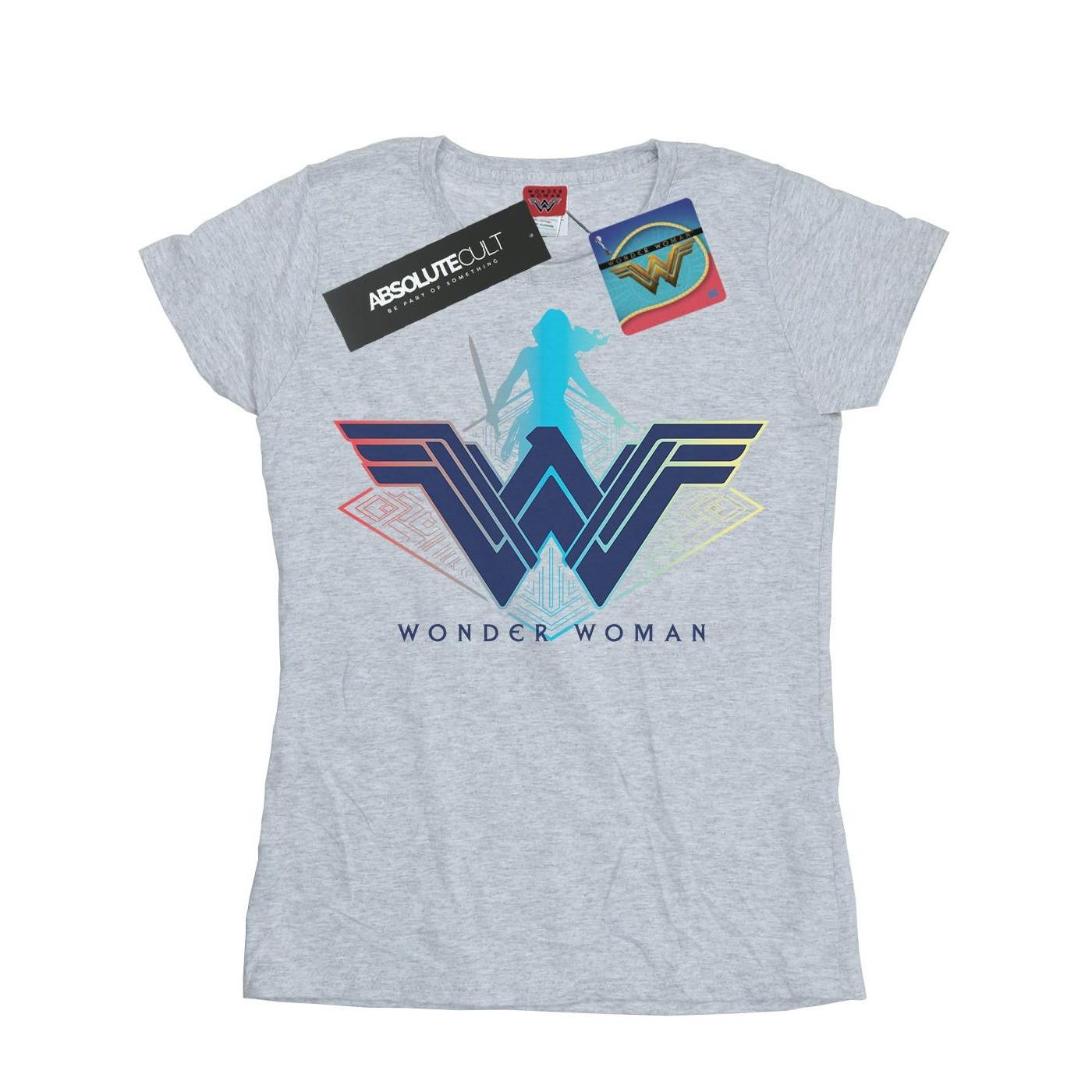 Dieses T-Shirt zeigt ein lebendiges Wonder Woman Logo und ist eine stilvolle Wahl für Fans. Das Design integriert das ikonische 'W'-Emblem mit einer Silhouette von Wonder Woman, umgeben von farbenfrohen geometrischen Mustern.