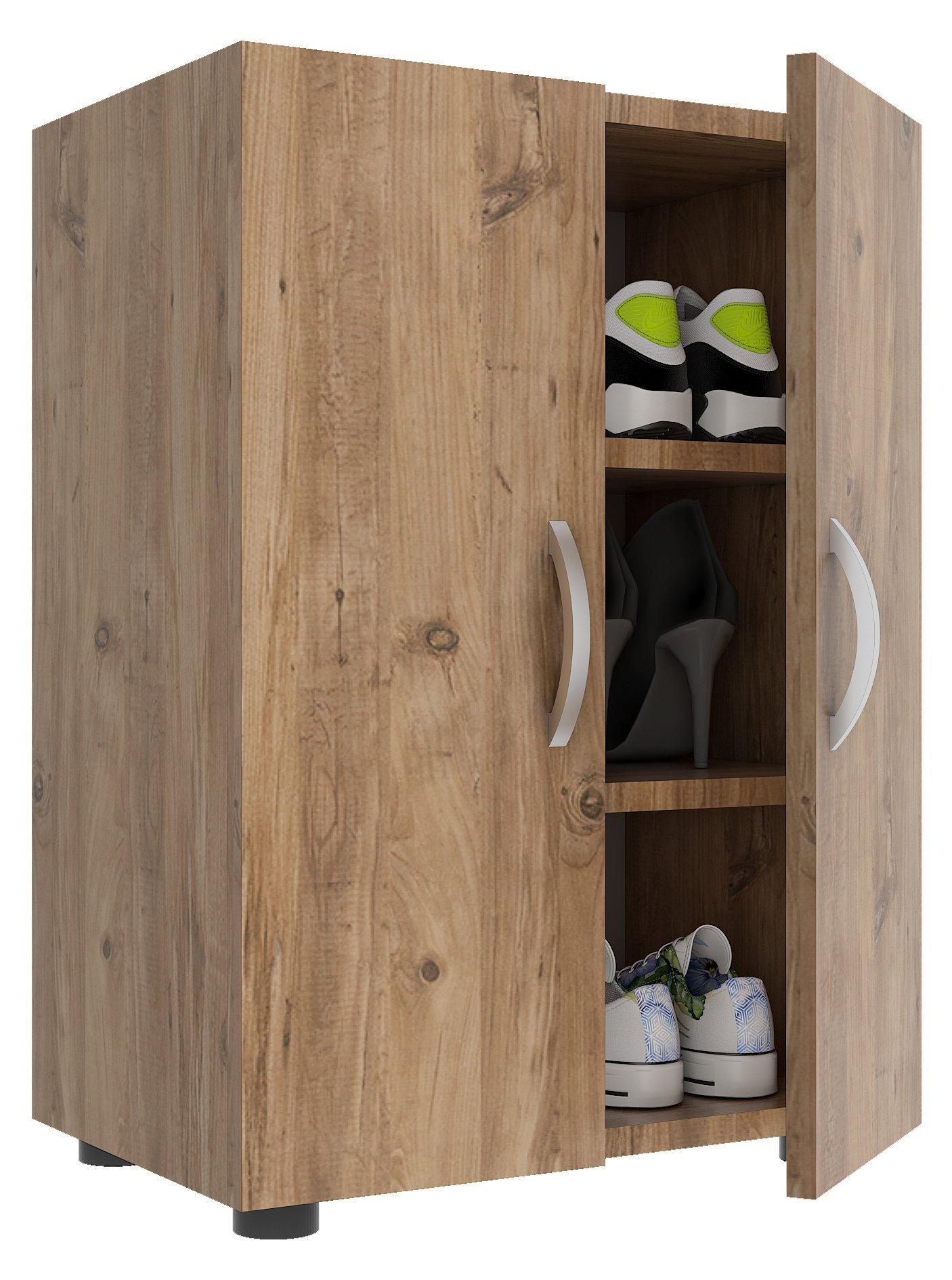 Der VCM Schuhschrank "Ulas 3-fach" mit zwei Drehtüren und drei Fächern bietet ausreichend Platz für Schuhe, Stiefel oder andere Utensilien.