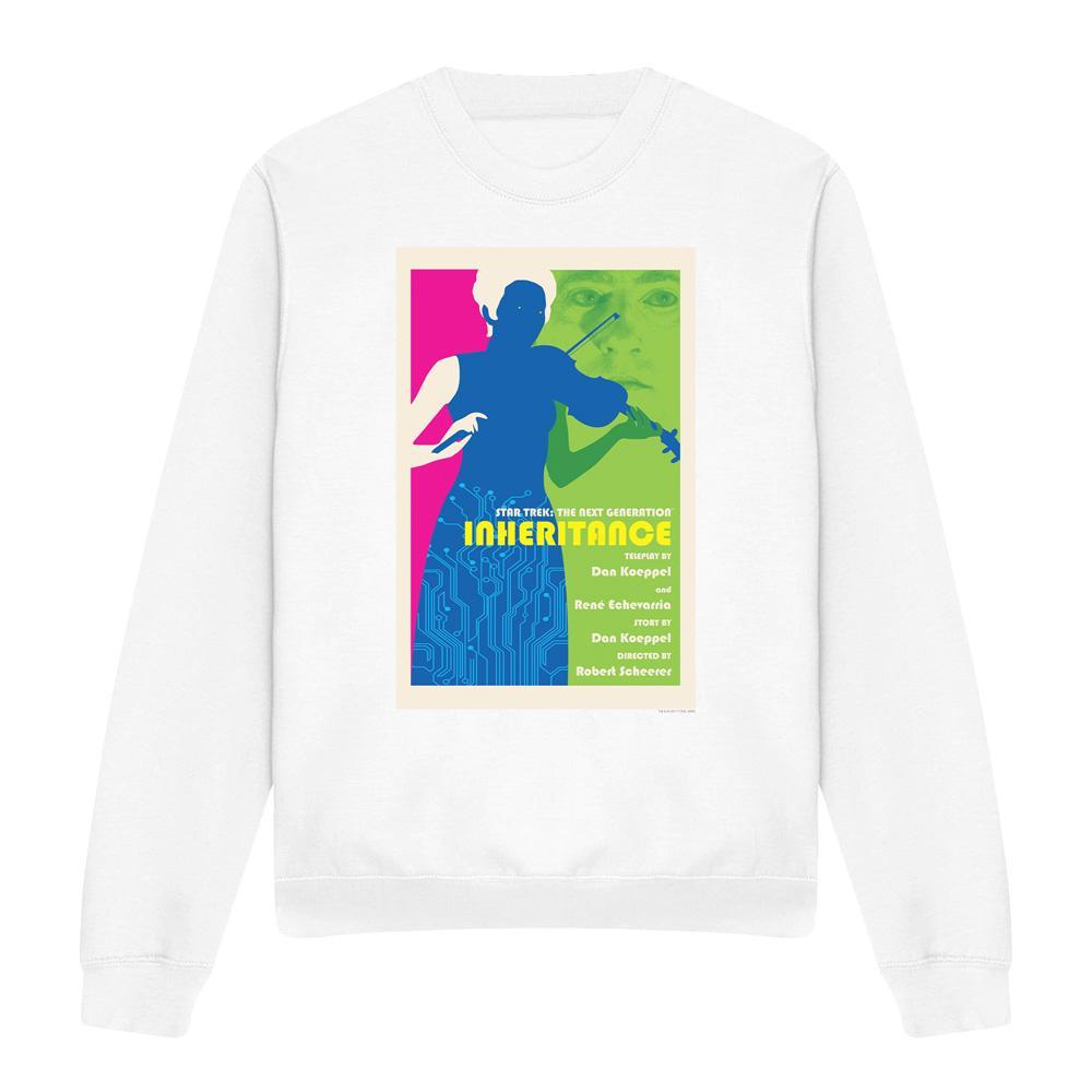 Dieses Sweatshirt zeigt einen lebendigen Grafikdruck, inspiriert von "Star Trek: The Next Generation" Staffel 7, Episode 10, mit dem Titel "Inheritance". Das Design zeigt eine stilisierte Figur, die Geige spielt, vor dem Hintergrund von Leiterplattenmustern und einem subtilen Gesichtsbild, das die Essenz des Themas der Episode einfängt.