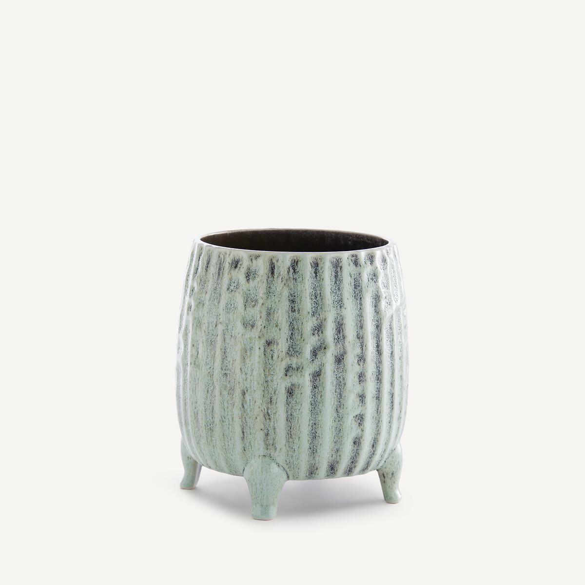 Zira wird in Portugal von Hand gefertigt und zeichnet sich durch einzigartige Details aus, die die Kunst der Töpferei widerspiegeln. Seine grüngrauen Schattierungen, die reliefartige Textur und die kleinen gebogenen Füsse erinnern an alte Übertöpfe.