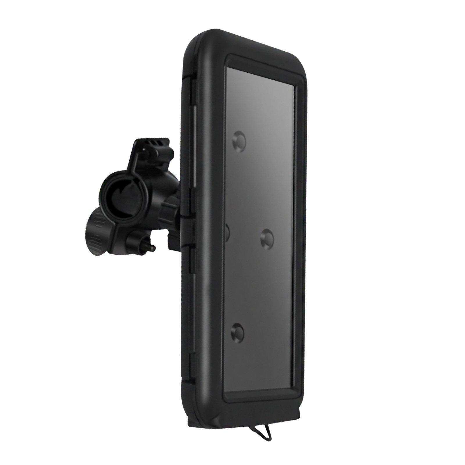 Handyhalterung mit Lenkerbefestigung. Kompatibel mit vielen auf dem Markt erhältlichen Smartphones. Wasserdichte und regenunempfindliche Halterung. 360° drehbar. Sichere Halterung mit frei zugänglichem Ladeanschluss.