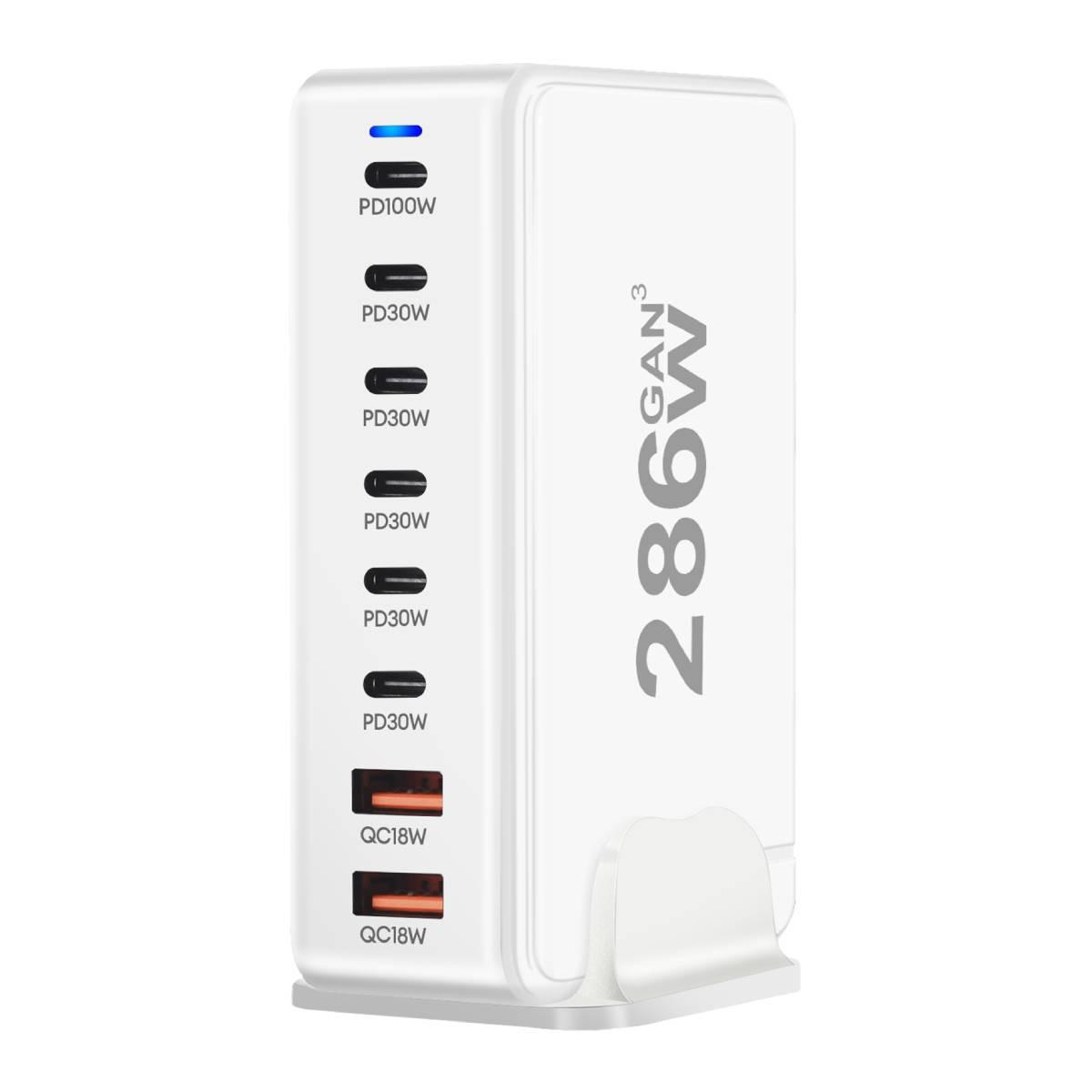 Laden Sie bis zu 8 Geräte gleichzeitig mit dieser ultraleistungsfähigen GaN-Ladestation mit 286 W. Mit 6 USB-C Power Delivery-Anschlüssen (davon 1 mit 100 W) und 2 USB Quick Charge-Anschlüssen mit 18 W sorgt sie für ein schnelles und sicheres Aufladen von Smartphones, Tablets, Laptops oder Zubehör. Die GaN³-Technologie sorgt für schnelles, effizientes und sicheres Laden bei geringerem Platzbedarf.