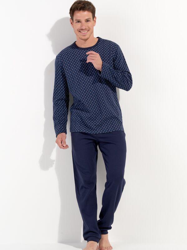 Dieses Pyjama-Set bietet Komfort und Stil für entspannte Stunden zu Hause. Das Langarm-Oberteil präsentiert sich in einem modischen und trendigen gemusterten Design mit V-Ausschnitt, während die lange, unifarbene Hose für eine bequeme Passform sorgt.