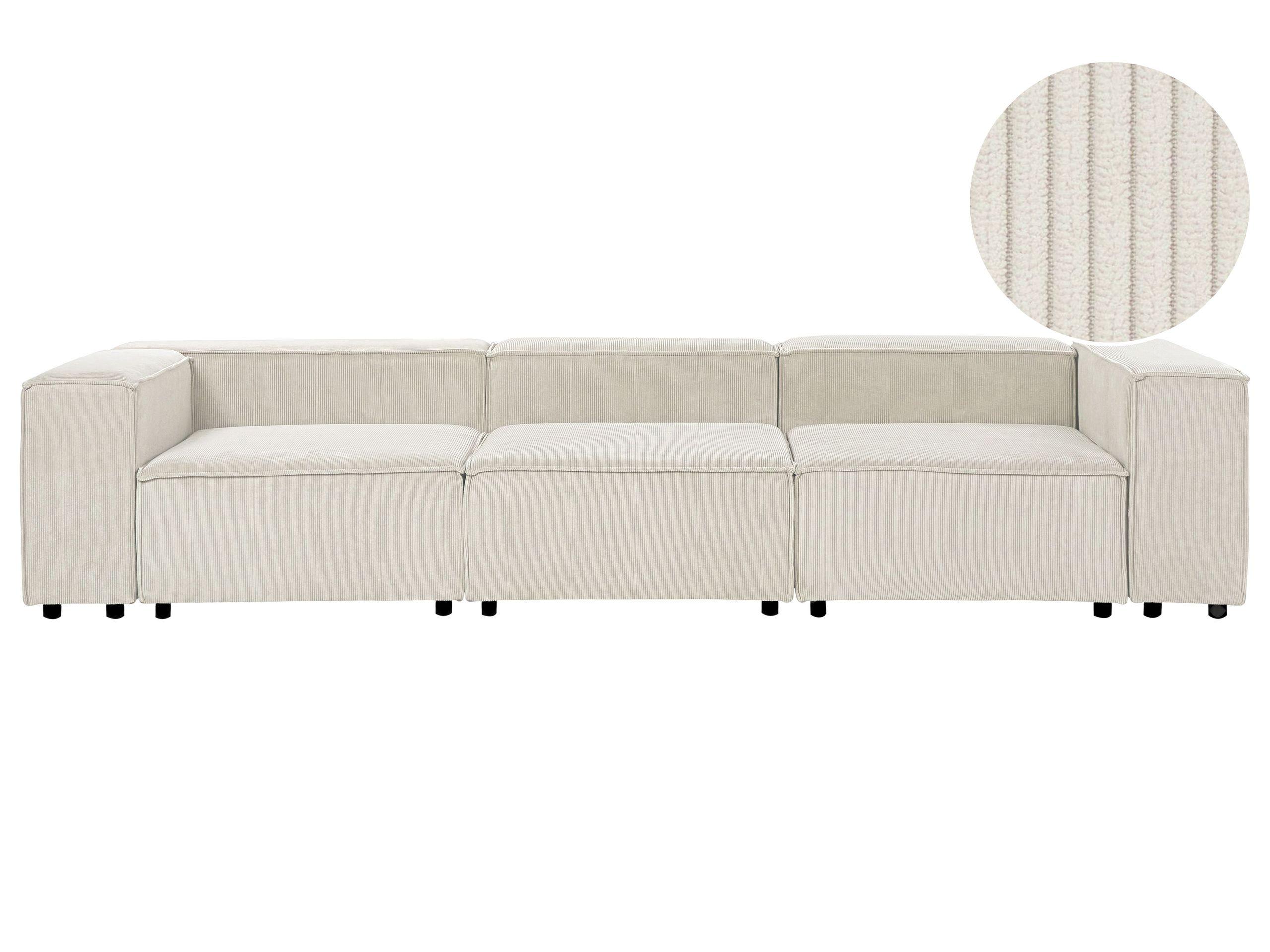 Modernes 3-Sitzer Modul-Sofa mit weichem Cordbezug. Mit diesem modularen Sofa erstellen Sie sich eine Sitzecke der besonderen Art. Alle Module sind rundum mit einem strapazierfähigen, dennoch kuschelig weichen Breitcord-Bezug versehen. So können Sie je nach Wunsch die Möbelstücke sowohl einzeln frei im Raum aufstellen, als auch zu einem gemütlichen 3-Sitzer Polstersofa zusammenfügen oder auch mit anderen Modulteilen aus der Kollektion kombinieren. Die Rückenlehne ist ideal an die Höhe der Armlehnen angepasst, so sitzt man bei jedem Fernsehabend sicherlich komfortabel. Während die niedrigen Beine und die robuste Konstruktion für Sitzsicherheit sorgen, unterstreichen die dicken Nähte die Formschönheit der einzelnen Modulsessel.